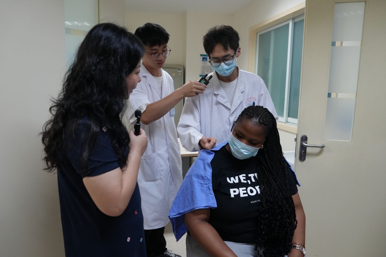 上午9时,代表团抵达一附院,在医院磁共振室副主任张岚的翻译下开展交流活动。代表团先后走访了儿科门诊与儿科药房,听取儿科专家魏明杰有关中医药在儿科疾病诊疗中的特色优势及临床应用成果的讲解;在综合门诊大厅,仲景宣讲团的成员向代表团介绍了医院历史沿革,生动讲述了延泰雕像背后的中医药传承故事,丰富了代表团对医院发展脉络与中医药文化底蕴的认知;走进中药房,付红主任向大家展示了中药饮片的炮制工艺与储存规范,深入解读了中药配伍理论及其临床疗效原理;最后,代表团来到康复中心、传统疗法中心,张世卿、冯宝荣两位专家现场演示针灸、推拿等传统疗法,引得代表团成员纷纷驻足体验,并不时发出赞叹。
