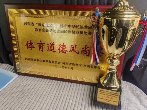 本网讯(文/图 关静涛)2025年10月18日至20日,由河南省民族宗教委、河南省教育厅、河南省体育局主办的河南省首届“豫来豫亲”民族健身操大赛在平顶山学院成功举行。在校党委统筹下,党委统战部和体育健康学院积极响应,组织队员参赛。最终,我校啦啦操队12名队员凭借出色表现,获得本科组二等奖,并在校团委的积极组织和广泛宣传下,获得道德风尚奖,彰显了学校体育育人的扎实成效。