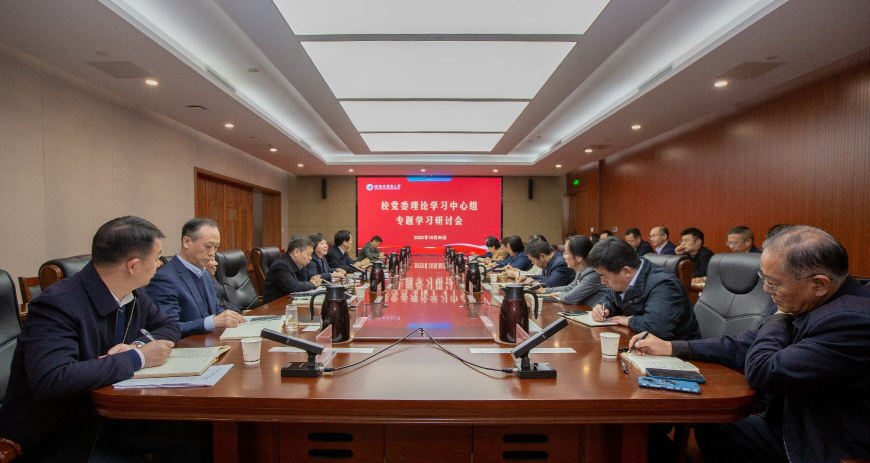 本网讯(文/王赞 图/郭寅虎)2025年10月30日,校党委理论学习中心组在俊学综合实验楼B605会议室召开专题学习研讨会,集中学习党的二十届四中全会精神,部署贯彻落实工作。校党委理论学习中心组全体成员参会。校领导李小芳、朱建光、彭新、张振强、马素玲、任献青结合学习体会,围绕“深刻领会全会精神”“推动高质量发展”“全面从严治党保障发展”“一体推进教育科技人才事业发展”“中医药文化传承创新发展”等主题进行研讨交流。会议由党委书记李小芳主持。