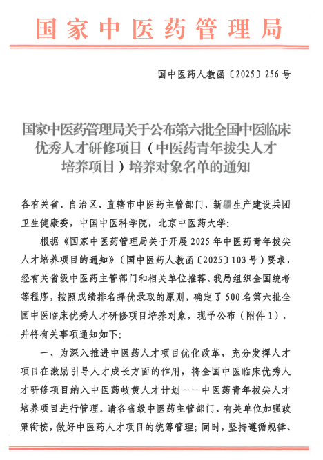全国中医临床优秀人才研修项目是国家中医药管理局于2003年启动的“岐黄工程”重点项目,旨在全国范围内选拔并培养中医领域的领军人物、优秀人才及骨干人才。经省级中医药主管部门的审核推荐和国家中医药管理局组织的全国中医药经典理论考试等程序,按照择优录取原则,确定100名中医临床优秀人才(基础类)为培养对象。