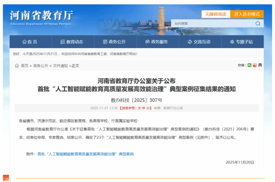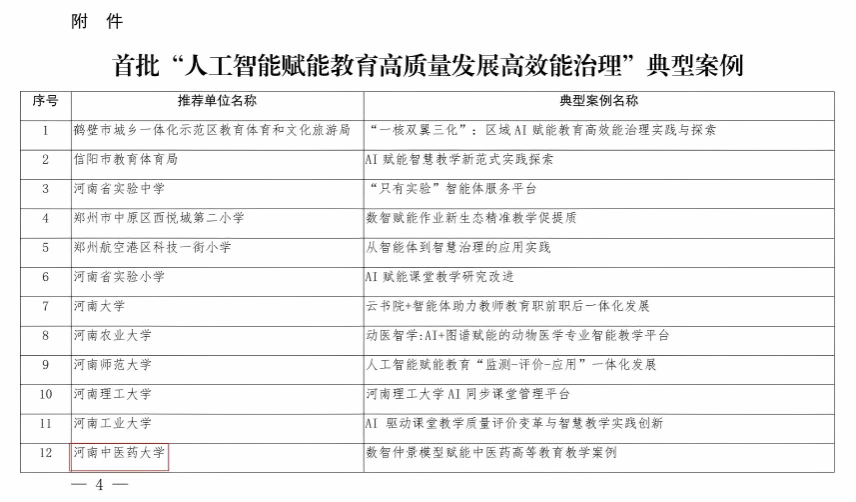 本网讯(文/图 余孝奎)近日,河南省教育厅发布了《关于首批“人工智能赋能教育高质量发展高效能治理”典型案例征集结果的公示》,我校信息化办公室(网络中心)报送的《数智仲景模型赋能中医药高等教育教学案例》成功入选,被认定为首批“人工智能赋能教育高质量发展高效能治理”典型案例。