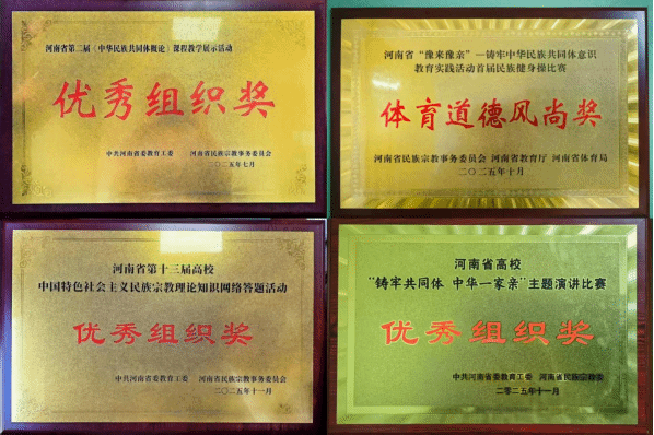 本网讯(文/图 刘文)为深入学习贯彻习近平总书记关于加强和改进民族工作的重要思想,全面贯彻中央民族工作会议、全国民族团结进步表彰大会精神,认真落实中央、省委关于民族工作的决策部署,推进学校铸牢中华民族共同体意识宣传教育,河南省民族宗教委、河南省教育厅、河南省体育局组织举办“豫来豫亲”——铸牢中华民族共同体意识主题教育实践活动。我校统筹推进,精心组织师生积极参与系列活动和比赛,分别在教学展示活动、主题演讲比赛、网络答题活动、民族健身操比赛4项活动中,获得优秀组织奖,参赛师生也连获佳绩。