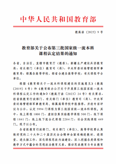 近年来,学校积极响应教育部、省教育厅关于一流本科课程建设的实施意见和要求,以一流专业、一流课程“双万计划”为抓手,深入推进一流本科课程建设,强化一流课程建设支持保障,充分发挥课程负责人在课程建设和人才培养工作中的组织和引领作用,多措并举促进课程建设高质量发展。新一批一流课程的入选,全面展现了学校课程建设的系统性成果,是学校持续推进课程改革创新,着力提升人才培养质量的重要体现。