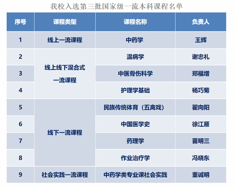 本网讯(文/图 刘宾)日前,教育部发布了《教育部关于公布第三批国家级一流本科课程认定结果的通知》,我校9门课程入选第三批国家级一流本科课程,其中线上一流课程1门,线下一流课程4门,线上线下混合式一流课程3门,社会实践一流课程1门。截至目前,我校共有24门课程入选国家级一流本科课程,建设数量居全国中医药高等院校前列。