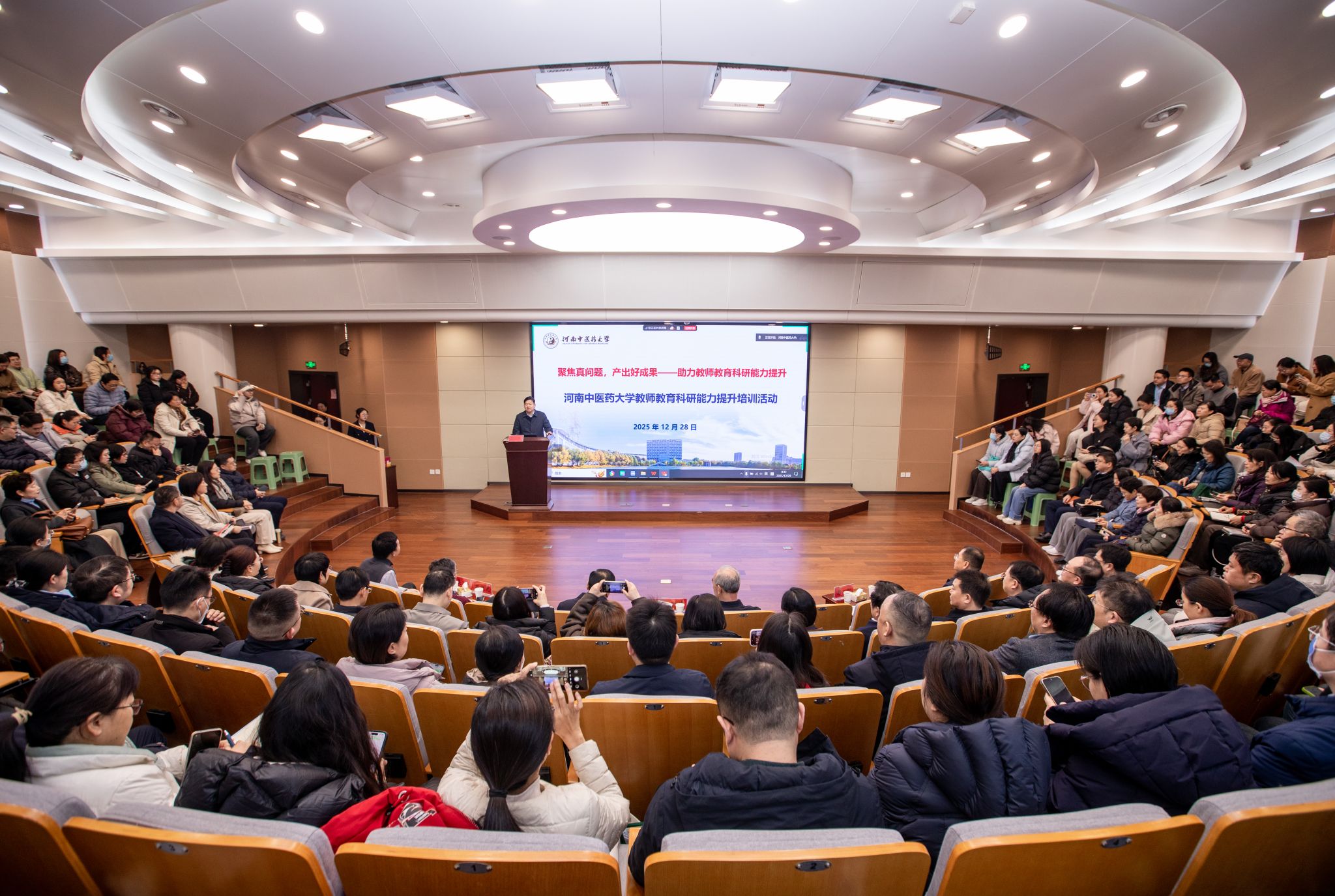 本网讯(文/刘力铭 图/吴晋一)为进一步深化有组织的教育科研体系建设,推动学校教育教学研究与改革走向科学化、专业化、系统化,产出更多高层次教学成果,2025年12月28日我校组织开展以“聚焦真问题,产出好成果——助力教师教育科研能力提升”为主题的教师教育科研能力培训活动,邀请北京中医药大学乔旺忠教授、北京大学施晓光教授和吴红斌研究员进行专题讲座。校长王耀献、副校长彭新、林俊堂出席活动,各学院院长、教学副院长、骨干教师及2025年新遴选的研究生导师等300余人通过现场和线上方式参加培训。彭新主持培训活动。
