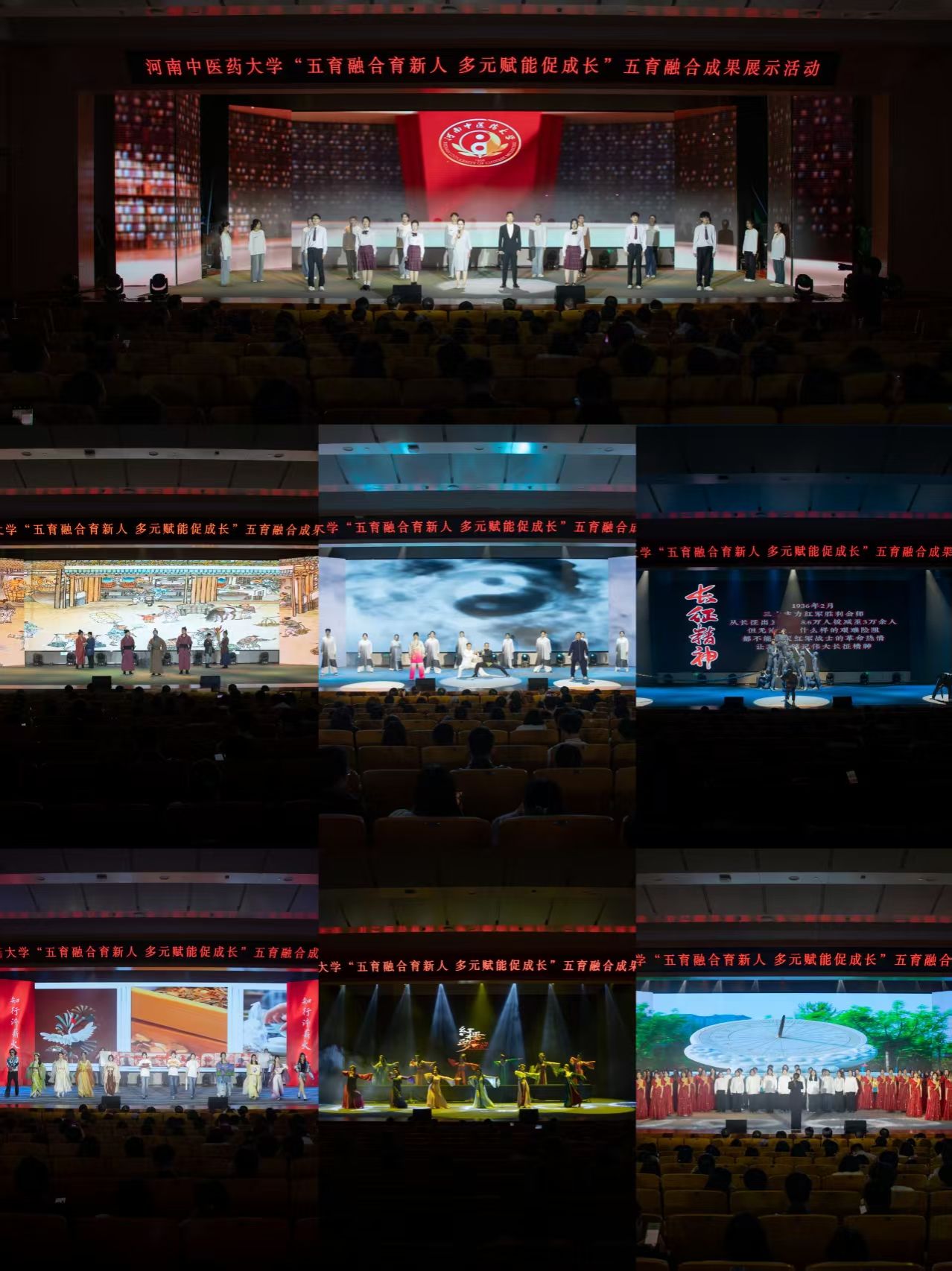 彭新主持舞台展示活动,德育、智育、体育、美育、劳动教育五个育人团队负责人依次汇报了工作开展情况及取得的成效,并以舞台艺术的形式进行了生动展示。德育团队以第一课堂、第二课堂教师联合开展沉浸式思政课的形式,将伟大抗战精神与中医药学子的使命担当深度融合;智育团队通过情景剧演绎,将中医经典传承与创新相结合,展示了岐黄文化的时代生命力;体育团队将传统武术、啦啦操与红色文化相结合,师生们在刚柔并济间展现青年学子的昂扬风貌;美育团队以美润心,用古典雅韵的民族舞和婉转悠扬的学生合唱传递了青春热忱与人文情怀;劳育团队依托劳动实践作品,展现了青年学子在劳动实践中锤炼品格、增长才干的成长历程。
