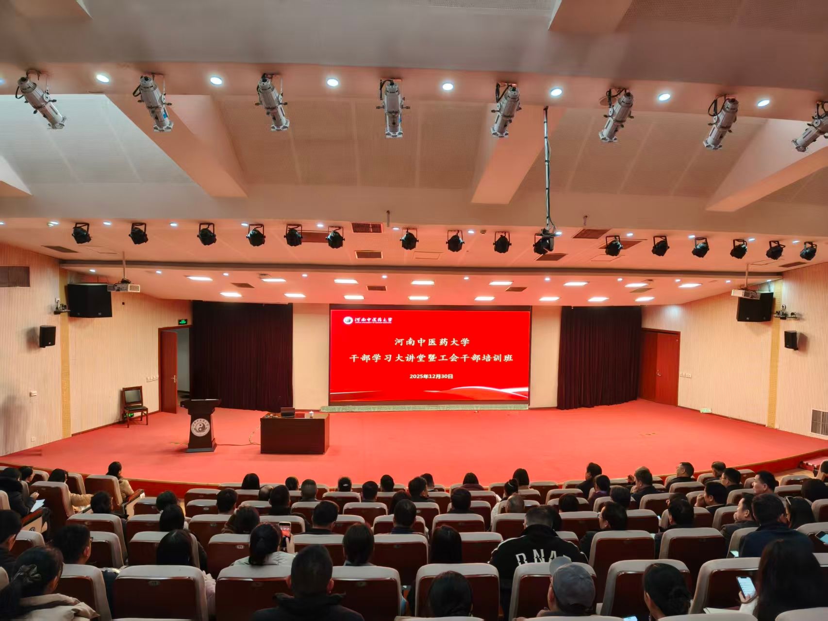 本网讯(文/图 荣文慧)为深入学习贯彻党的二十届四中全会精神,全面落实习近平总书记关于工会工作的重要论述,进一步强化工会干部队伍建设,切实提升工会干部和“双代会”代表履职能力,校工会于2025年12月30日下午举办校内干部学习大讲堂暨工会干部培训班。校本部及各附属医院200余名工会专兼职干部和“双代会”代表参加培训。开班仪式由校工会副主席王浩然主持。