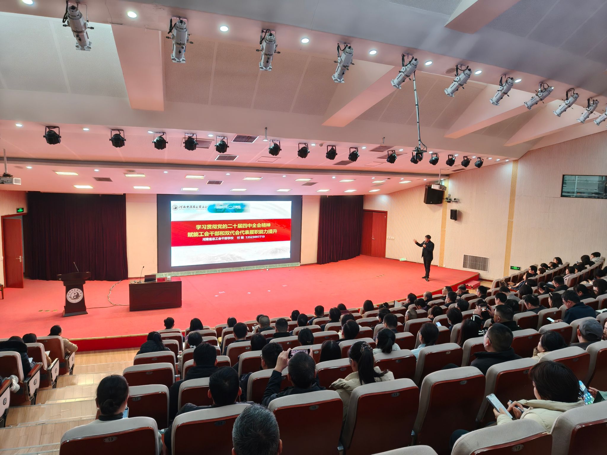 本次培训特别邀请省总工会干部学校高级讲师付朝教授作《学习贯彻党的二十届四中全会精神——赋能工会干部和教职工代表履职能力提升》的专题讲座。付朝教授长期致力于工会工作教学研究,不仅参与《河南省工会条例》等重要法规修订,还主编多部工会专业教材,多次深入地方工会和基层授课,受到基层职工群众和广大工会干部的好评。讲座中,他立足党的二十届四中全会背景下,新时代高校民主建设与“双代会”制度要求,对代表权利义务、角色定位进行了精准透彻的解读,内容既紧扣政策法规,又紧密结合高校、医院实际,主题鲜明、内涵深刻、逻辑清晰、重点突出,为工会干部和代表们高质量完成各项任务、充分发挥民主管理和桥梁纽带作用提供了坚实的理论指引,赢得了现场阵阵掌声。