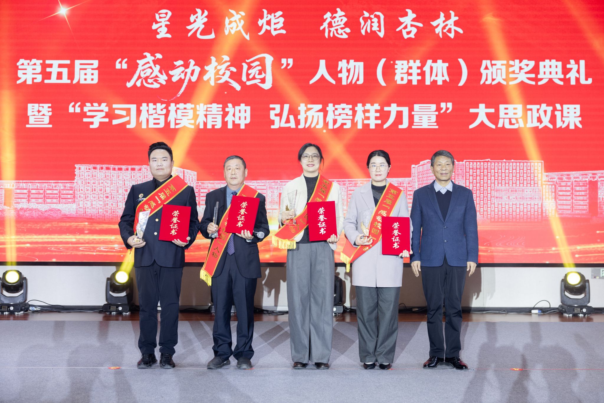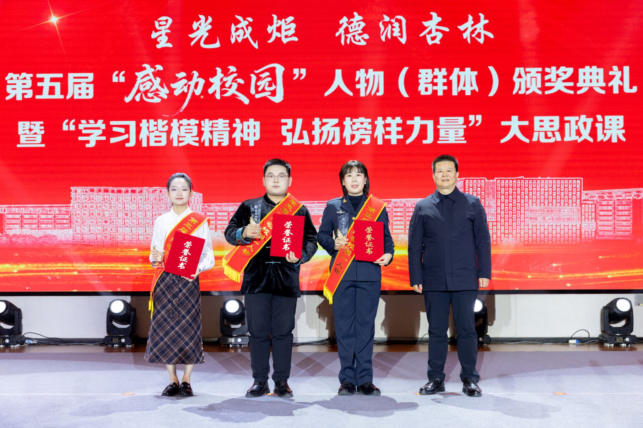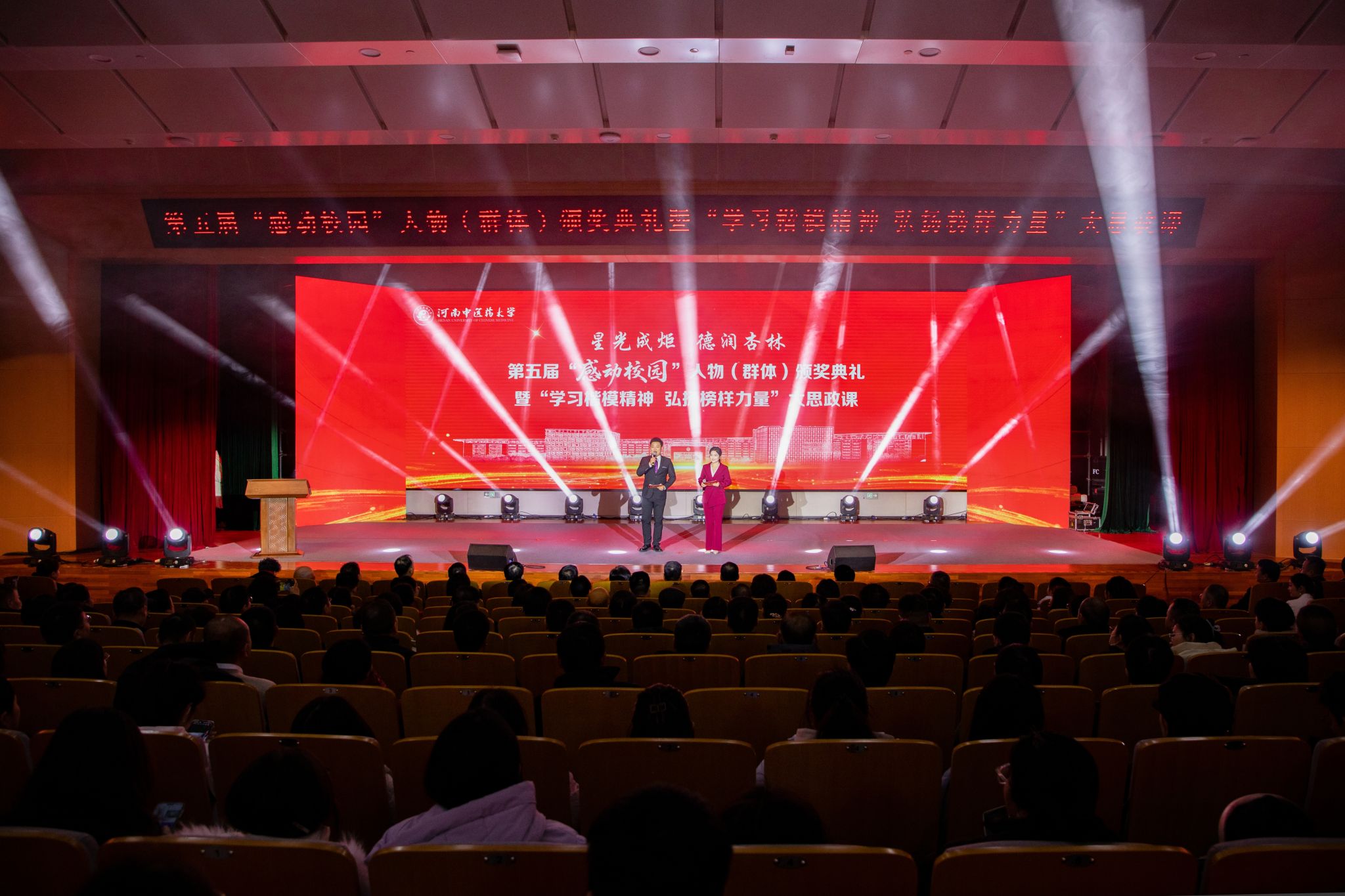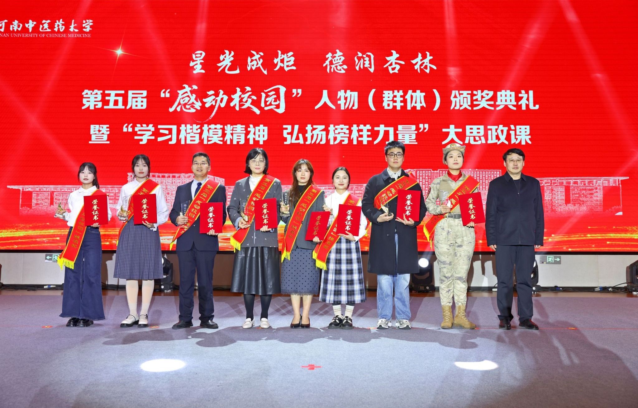立德树人守初心,文明浸润育新人。2026年1月6日,河南中医药大学俊学实验综合楼B101报告厅暖意涌动、掌声如潮,第五届“感动校园”人物(群体)颁奖典礼暨“学习楷模精神,弘扬榜样力量”大思政课隆重举行。一堂以榜样为教材的专题思政课深情开讲,全体校领导与师生代表齐聚一堂,在榜样力量的感召下共同汲取奋进力量。