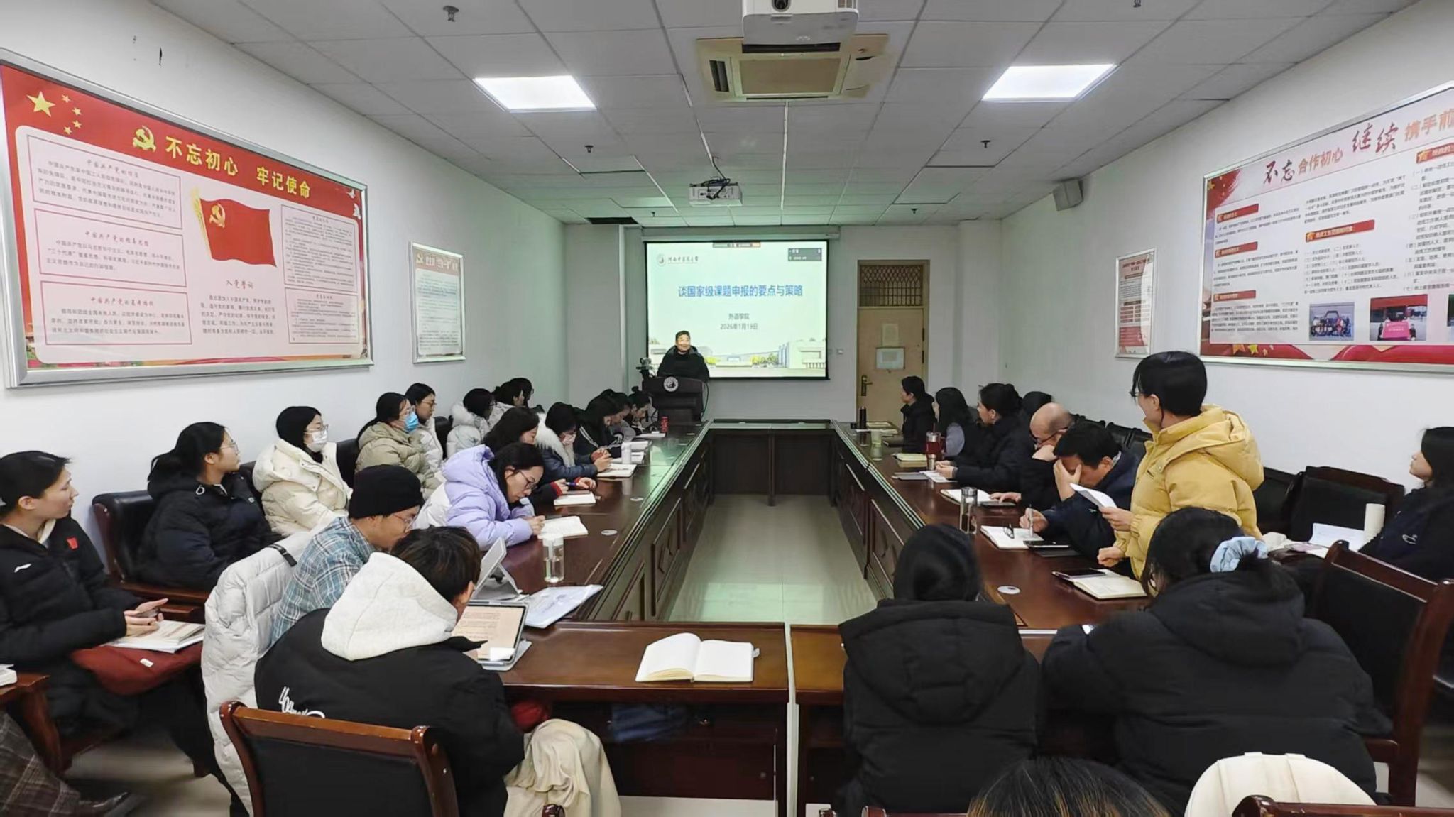 本网讯(文/马笑峰 图/胡志伟)2026年1月19日,由学校科学技术处主办、外语学院承办的“百家论坛”学术讲座在教学实验大楼A638会议室举办。本次活动特邀南京师范大学董晓波教授以“国家级课题申报的要点与策略”为题开展讲座。学院领导班子成员、全体教师及翻译硕士研究生以线上线下结合的方式参加,讲座由外语学院副院长李蕊主持。