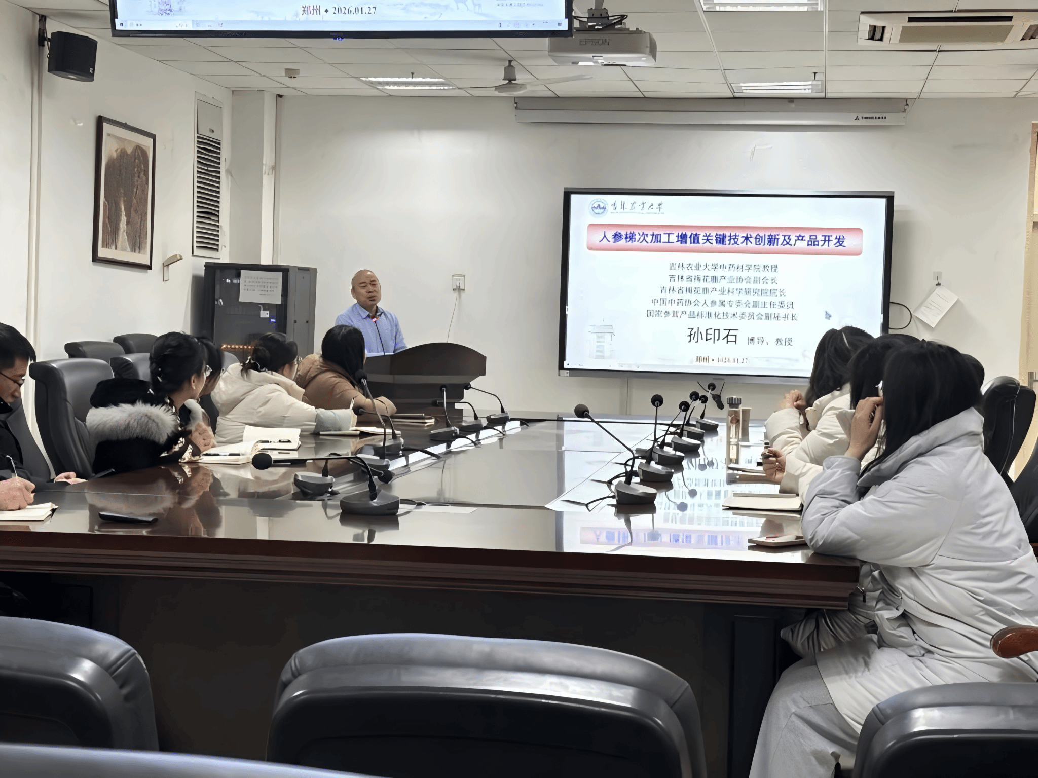 本网讯(文/孙彦君 李孟 图/李彦龙)2026年1月27日,由学校科学技术处主办、药学院承办的“百家论坛”系列学术活动在BM636会议室顺利举行。本次论坛特邀吉林省梅花鹿产业科学研究院院长、吉林农业大学中药材学院孙印石教授担任主讲嘉宾,以“人参梯次加工增值关键技术创新及产品开发”为主题,为师生带来了一场兼具学术深度与产业价值的思想盛宴。药学院相关负责人、领域科研骨干及硕博士研究生等50余人参与本次学术交流。