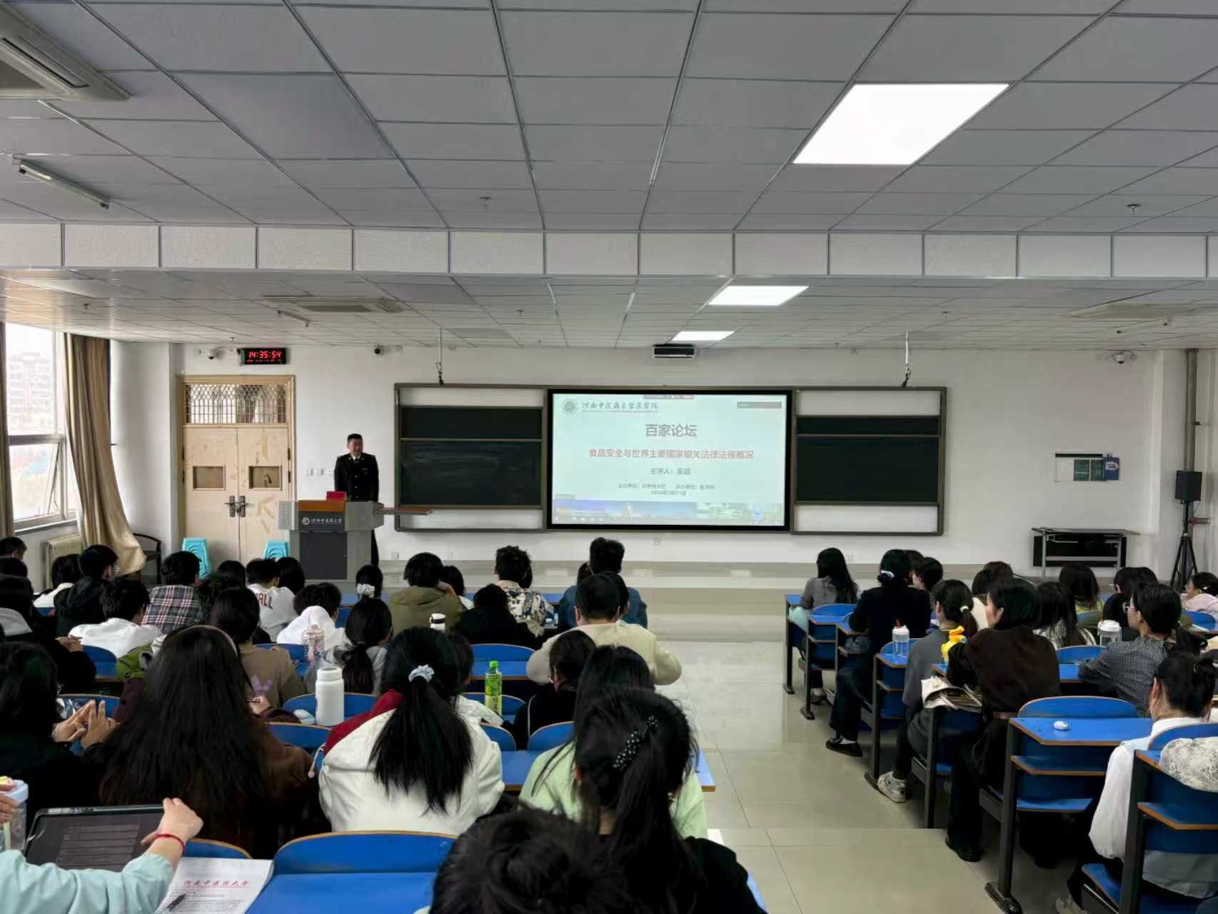 本网讯(文/徐雨童 王鸿飞 图/李想 李世宇)为扎实推进食品卫生与营养学学科建设,提升相关专业学生的国际视野、法规认知与专业素养,2026年3月31日,由科学技术处主办、医学院承办的“百家论坛”在教学实验楼四楼阶梯教室举办。郑州海关所属漯河海关副关长吴超应邀作题为《食品安全与世界主要国家相关法律法规概况》的学术讲座。医学院党委副书记孙俊波及公共卫生与预防医学教研中心、科研办、学工办教师代表,医学院食品卫生与营养学专业学生及全校学生代表通过线上线下结合的方式共同参会学习。讲座由副院长李寒冰主持。