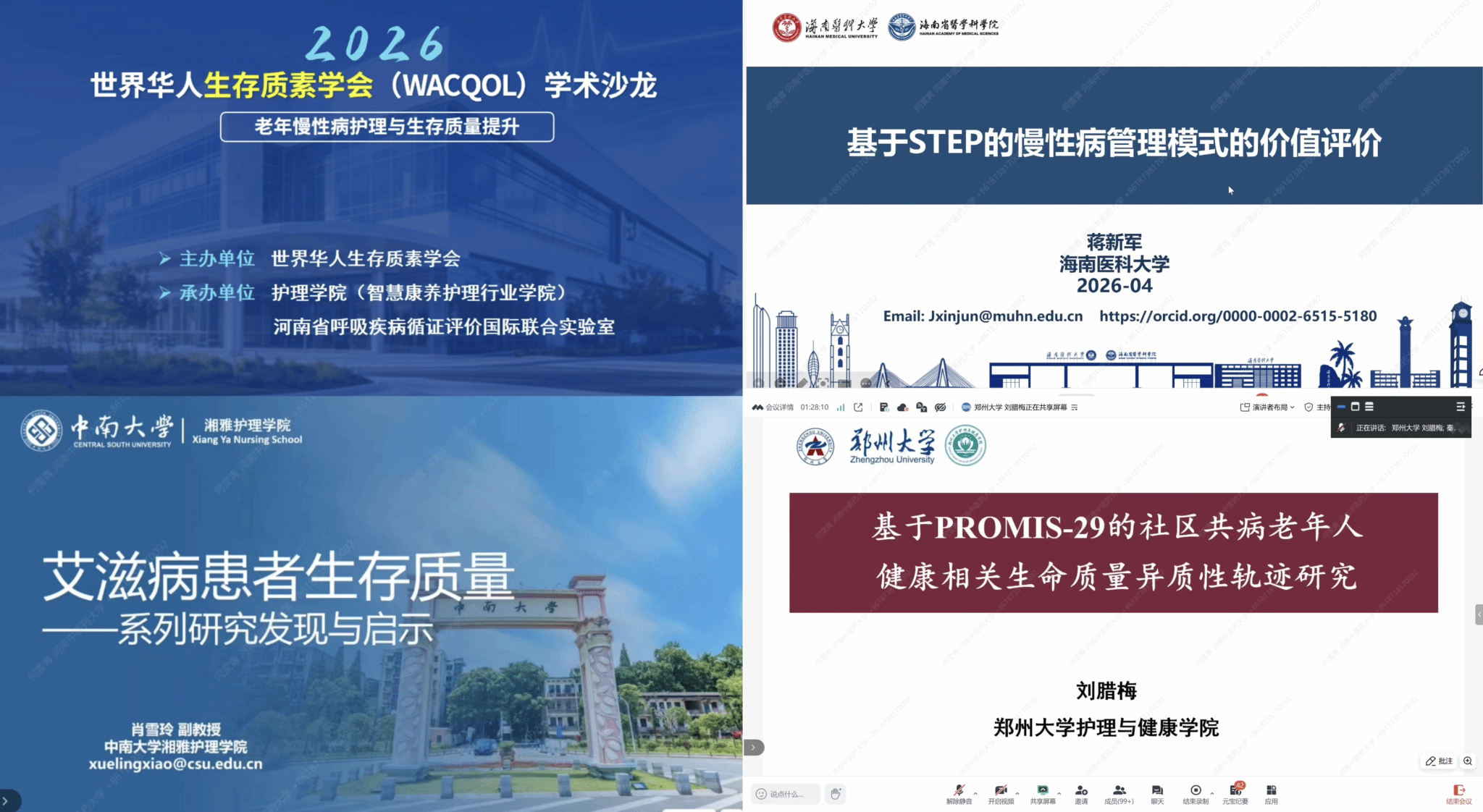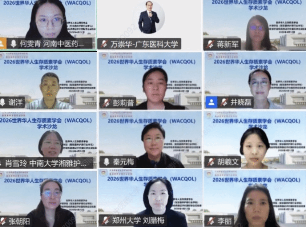 本网讯(文/图 何雯青)在国际护士节来临之际,为进一步推动老年慢性病护理领域的学术交流与科研创新,提升护理学领域生存质量研究的实践转化能力,2026年4月12日,由世界华人生存质量学会(WACQOL)主办,我校护理学院与河南省呼吸疾病循证评价国际联合实验室联合承办的“2026世界华人生存质素学会第三期学术沙龙”于线上成功举办。本次沙龙以“老年慢性病护理与生存质量提升”为主题,汇聚国内外护理学界专家学者,共研学科前沿,共享科研成果。活动由河南中医药大学护理学院院长秦元梅与河南省呼吸疾病循证评价国际联合实验室主任谢洋共同主持,200余名学者线上参会。