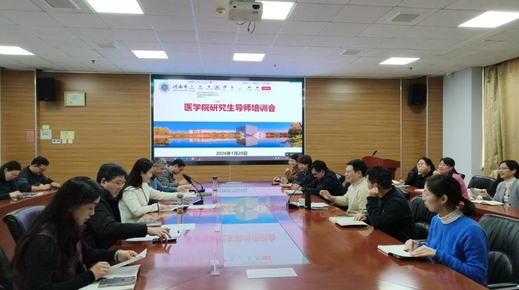 本网讯(文/图 李晓娟)为了进一步提升医学院导师队伍建设水平,2026年1月20日,医学院在教学实验楼A447会议室举办了研究生导师培训会。医学院院长曹珊、副院长李寒冰、闫国立、冯龙以及各学位点负责人、秘书、全体研究生导师、行业导师通过线上线下结合的方式参加培训。会议邀请河南农业大学副教授黄淑成作报告。培训会由李寒冰主持。