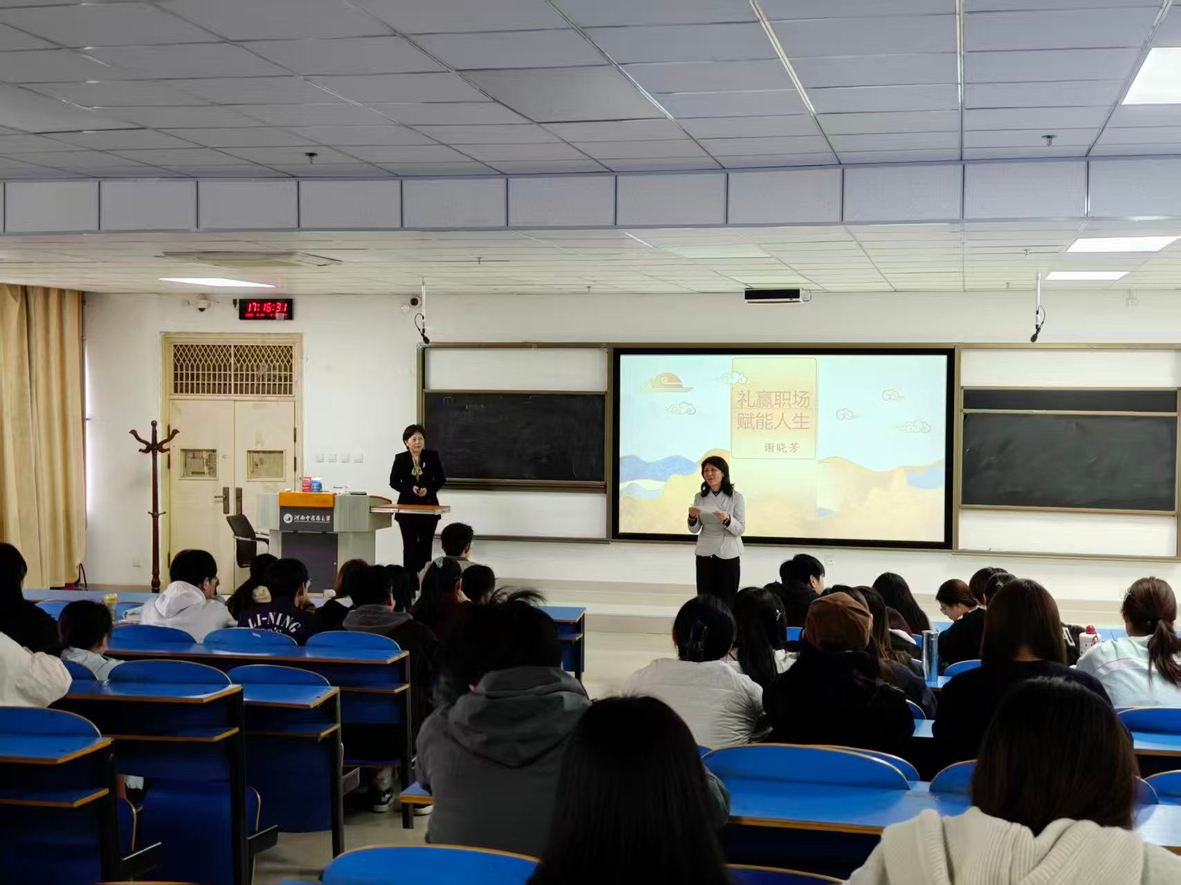 本网讯(文/李慧明 图/徐扬)为进一步提升学院学生干部的个人素养和礼仪水平,帮助学生干部熟悉礼仪规范,将礼仪融入校园生活与日常工作,更好地发挥学生干部的先锋模范作用,2026年3月25日,管理科大联合学院邀请郑州航空工业管理学院谢晓芳教授在教学实验楼三楼阶梯教室举办“礼赢职场,赋能人生”专题讲座,本次讲座由学院党委书记刁青蕊主持,学院辅导员老师及全体学生干部参加。