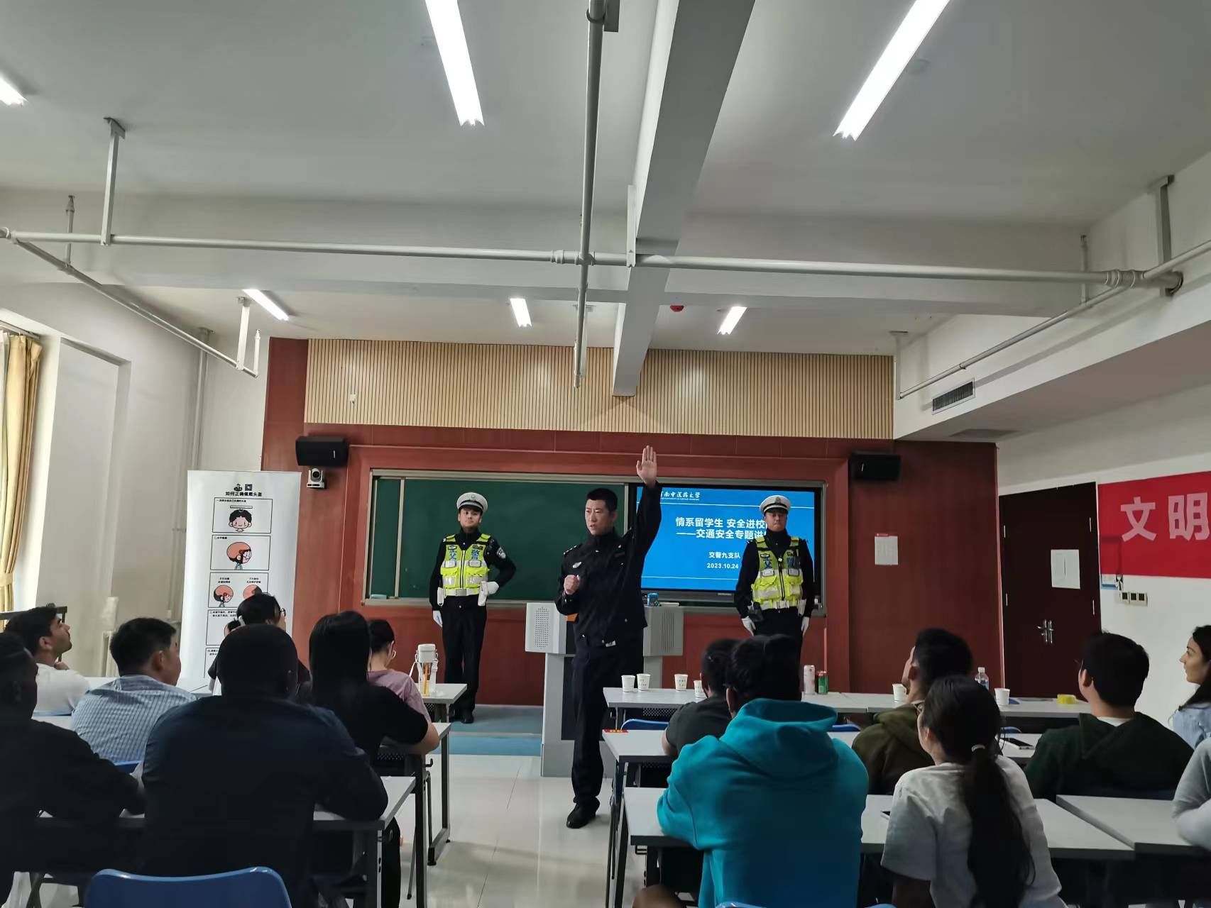 本网讯(文/图 李佳贞)为进一步加强来华留学生的交通安全意识,提高来华留学生对中国交通法律法规的理解,2023年10月24日,国际教育学院邀请郑州交警九支队为来华留学生举办“情系留学生 安全进校园”交通安全专题讲座。学院党总支副书记潘万旗,留学生工作办公室老师及在郑留学生参与了此次讲座。