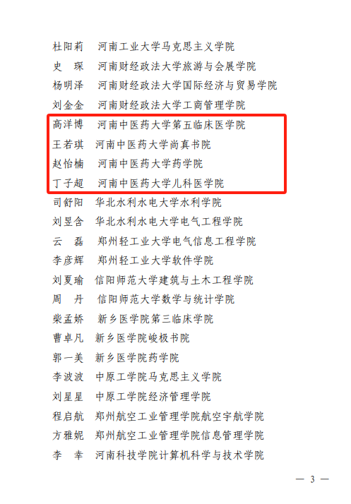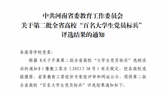 本网讯(文/翟羽佳 图/文件部分截图)近日,河南省教育厅办公室发布《关于第二批全省高校百名大学生党员标兵评选结果》的通知,我校第五临床医学院高洋博、尚真书院王若琪、药学院赵怡楠、儿科医学院丁子超4名同学获评河南省“大学生党员标兵”荣誉称号。