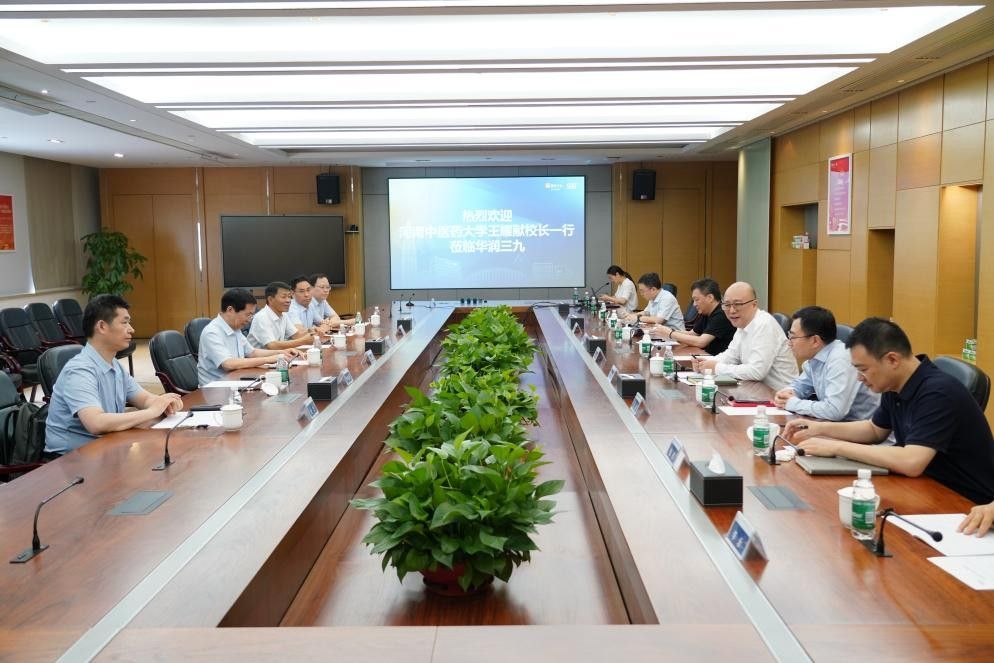 在随后举行的座谈会上,王耀献以“昨天、今天、明天”为脉络,系统介绍了学校的办学历史、学科特色优势及未来发展规划。华润三九总裁吴文多、副总裁王亮、国药事业部总经理钱伟分别就公司的先进管理理念、创新研发体系、校企合作模式及新药开发进展等进行了详细介绍。双方回顾了以往合作历程,展望了未来合作前景,并就具体合作项目进行了初步磋商。