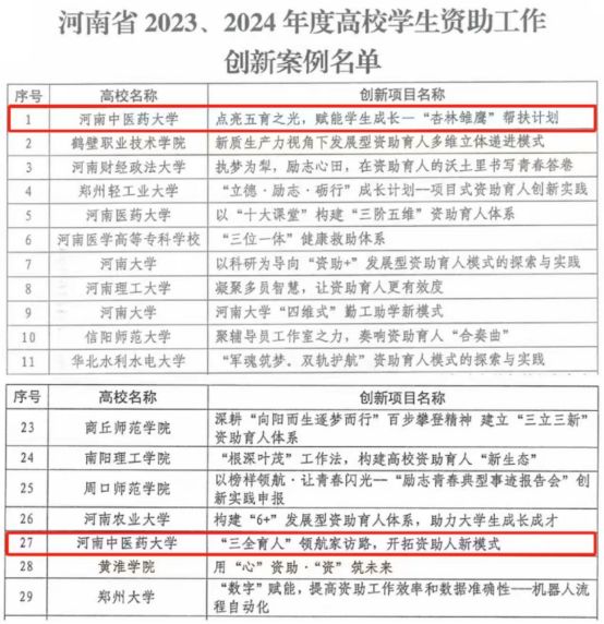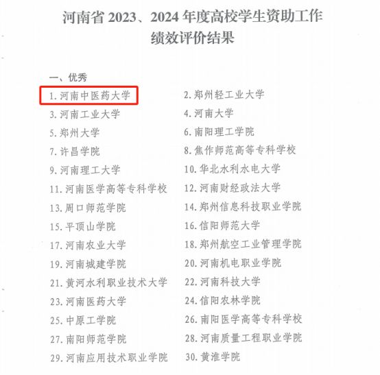 本网讯(文/图 吴明明)日前,河南省教育厅、国家开发银行河南省分行联合印发《关于公布全省学生资助工作绩效评价结果的通知》。我校在全省173所参评高校中脱颖而出,第12次获得全省高校学生资助工作绩效评价优秀等次榜首。我校申报的《点亮五育之光,赋能学生成长——“杏林雏鹰”帮扶计划》《“三全育人”领航家访路,开拓资助育人新模式》成功入选全省学生资助工作创新项目,其中《点亮五育之光,赋能学生成长》以总分第一名获评。
