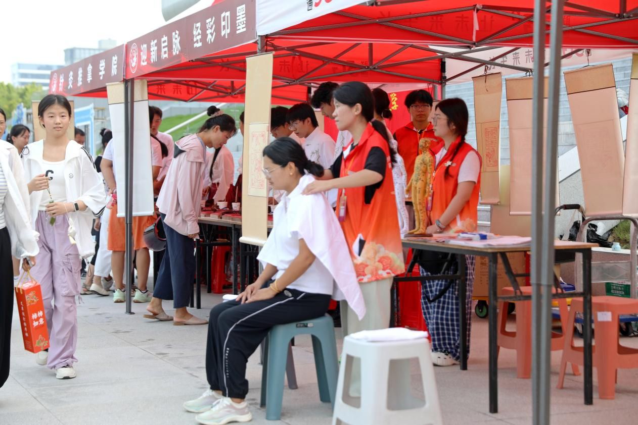 迎新现场不仅是办理报到的驿站,更是新生开启人生新篇章的起点。极具中医药文化特色的各类活动与花式“开学大礼包”吸引新生和家长驻足参与,欢声笑语拉近了新生与学校的距离,让大家沉浸式感受到了中医药的魅力。中药养生茶为大家驱散了暑气,带来丝丝清凉;拓印、环保布袋手绘、蜜丸制作体验、猜中药名等趣味活动,勉励新生不断探索挖掘中医药宝库的奥秘;独具创意的手持立牌,写满学长学姐的美好祝福;志愿者们为家长们提供推拿按摩、中医药知识宣讲等服务……“这边走”“我帮你拿”,学长学姐们热情的接待和温暖的叮嘱将新生的拘谨慢慢化成轻松愉悦的笑声,为新生在河中医的第一天留下美好而深刻的记忆。