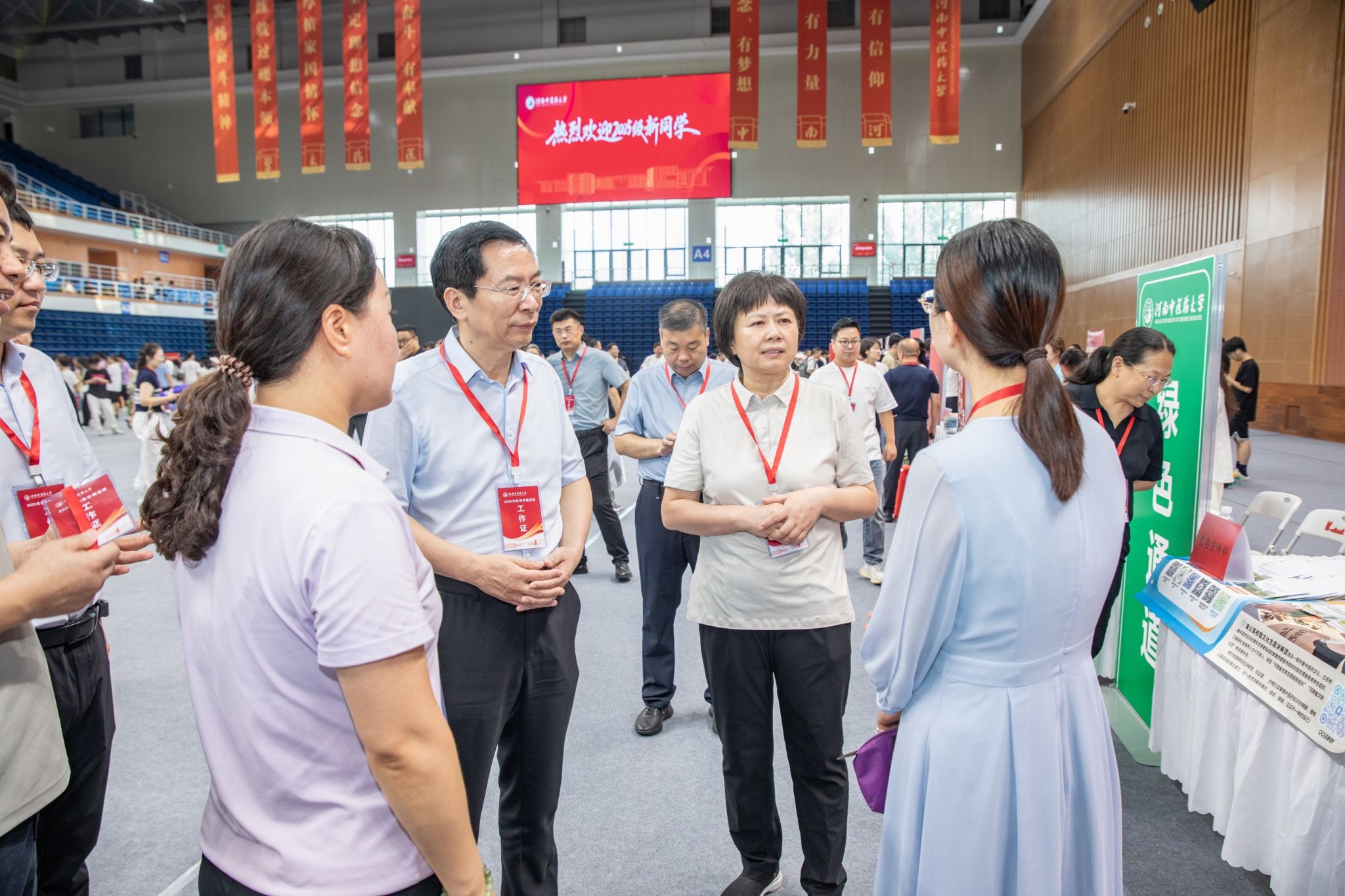晨曦初露,校园内绚丽的条幅再度舞动,“热烈欢迎新同学”的字样衬着处暑的阳光格外鲜亮。新建成的体育馆在迎新之日启用,馆外,各学院、书院精心设计的迎新展板、打卡点和丰富多彩的文化体验活动饱含着对新生的祝福与期待,馆内,各部门、单位的服务点、业务办理台整齐排开。学校在地铁1号线市体育中心站设立了接待服务站,崭新的大巴车有序停放,方便新生及家长安全快速入校,同时干净整洁的摆渡车也在校园内待命,为新生提供方便快捷的校内接送服务。全体河中医人以最充足的准备、最饱满的热情迎接新同学的到来,