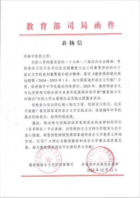 河南中医药大学“杏林丹若坊”工作室“同心”社会实践团队入选“推普助力乡村振兴”全国大学生暑期社会实践志愿服务重点团队,并从北京大学等1000支全国重点团队和北京科技大学等全国1000支参与协同团队中脱颖而出,荣获“优秀团队”。教育部语言文字应用管理司、共青团中央青年发展部向我校致表扬信。
