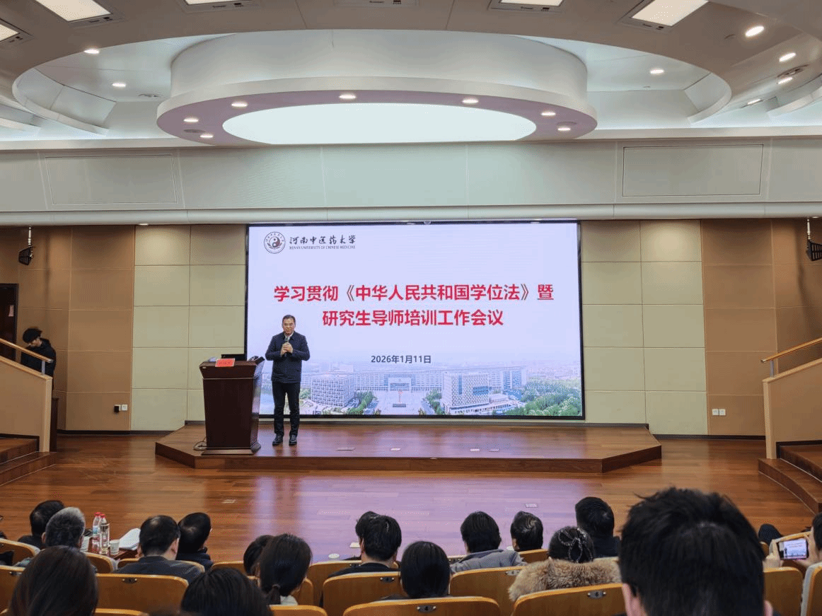 本网讯(文/翟优 图/赵亚鑫)2026年1月11日,我校开展了“学习贯彻《中华人民共和国学位法》暨2025年新晋研究生导师培训”。培训会邀请了北京大学人民医院王建六教授、北京中医药大学霍增辉教授和闫永红教授进行专题讲座。校长王耀献、副校长林俊堂出席活动,各学院主管研究生教育负责人、学校研究生院全体工作人员、2025年新晋研究生导师、行业导师及部分研究生导师等900余人通过现场和线上方式参加培训。培训由林俊堂主持。