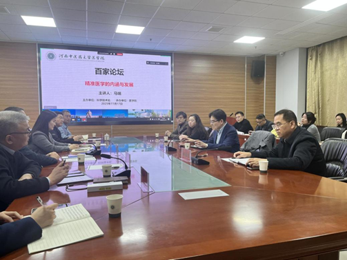 本网讯(文/郑关民 图/柳阳)2025年11月17日下午,由科技处主办、医学院承办的“百家论坛”在教学实验楼医学院会议室A447举行,复旦大学代谢分子医学教育部重点实验室副主任、博士生导师马端教授应邀作《精准医学的内涵与发展》专题报告。副校长林俊堂、医学院领导班子、马端教授研究团队成员及30余名科研骨干参加讲座。