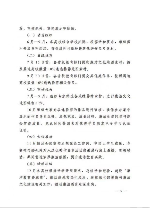 1.初评。由各单位参照《教育部办公厅关于举办第十届高校廉洁教育系列活动的通知》自行组织,其中“传廉促担当”廉洁文化地图素材征集相关材料于2025年7月6日前报送至校纪委,其他作品相关材料于2025年9月5日前报送至校纪委。