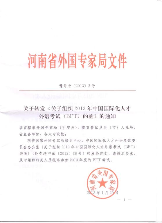 转发河南省外国专家局关于转发《关于组织2013年中国国际化人才外语考试(BFT)的函》的通知