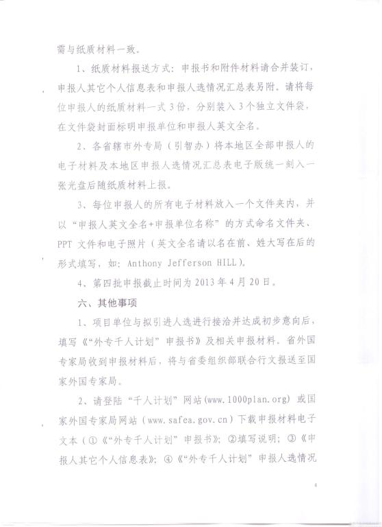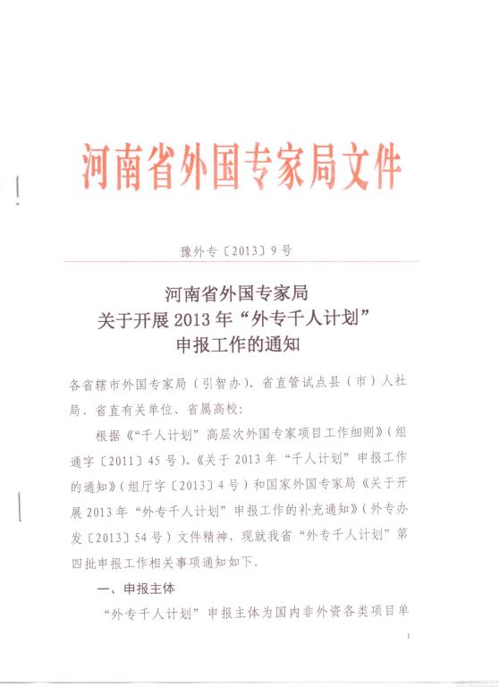 现将河南省外国专家局《关于开展2013年“外专千人计划”申报工作的通知》(豫外专【2013】9号)予以转发,请积极组织申报,并将申报材料4月15日前报送国际合作处。
