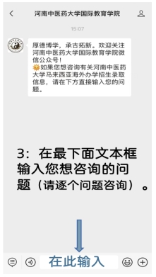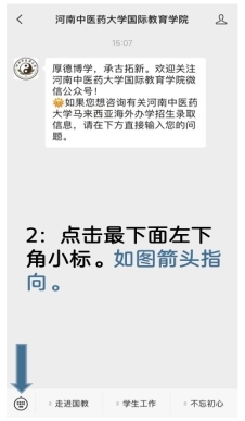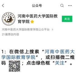 (1)在微信上搜索公众号“河南中医药大学国际教育学院”或扫描二维码,点击“关注”。
