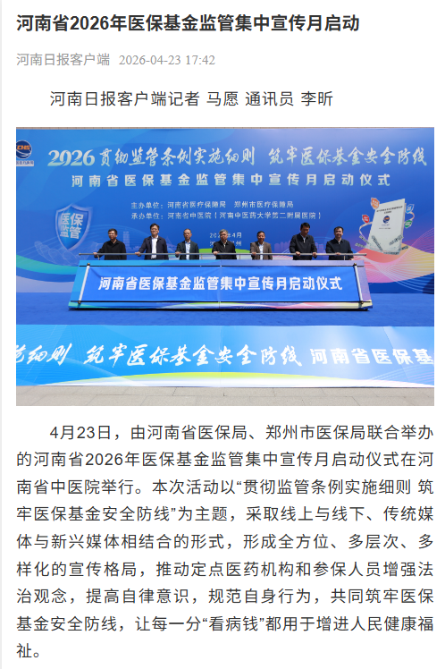 4月23日,由河南省医保局、郑州市医保局联合举办的河南省2026年医保基金监管集中宣传月启动仪式在河南省中医院举行。本次活动以“贯彻监管条例实施细则 筑牢医保基金安全防线”为主题,采取线上与线下、传统媒体与新兴媒体相结合的形式,形成全方位、多层次、多样化的宣传格局,推动定点医药机构和参保人员增强法治观念,提高自律意识,规范自身行为,共同筑牢医保基金安全防线,让每一分“看病钱”都用于增进人民健康福祉。