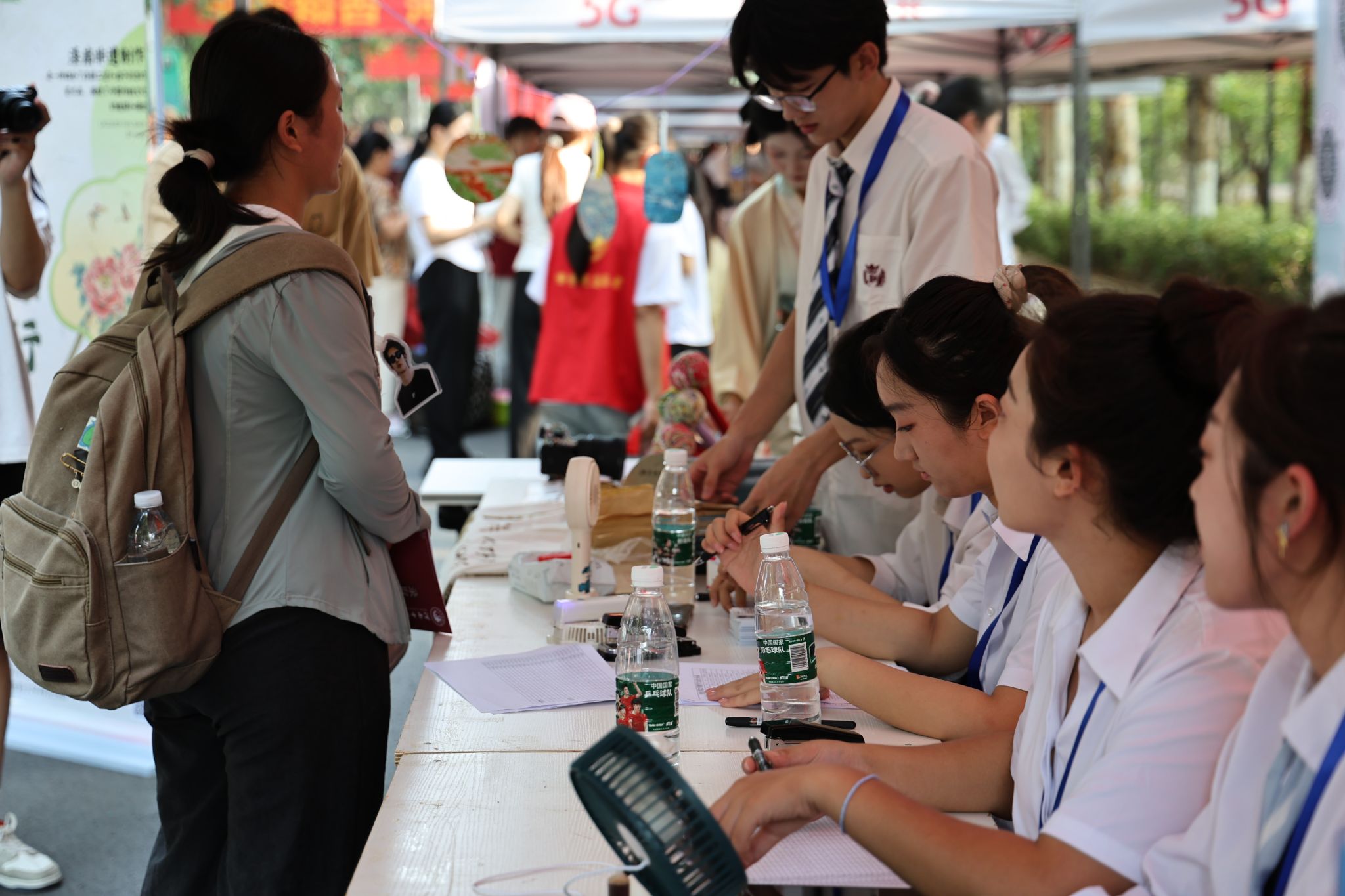 迎新现场,助班与志愿者们收集入学材料、高效办理入学手续、发放新生入学大礼包、耐心解答各种问题,帮助新生快速熟悉校园环境。特色展板错落有致,生动展现了学院师生风采、专业特色及师资力量,成为吸引新生及家长目光的焦点。此外,学院收集了480名新生照片,精心设计制作了一幅照片墙,寓意2024级这个大家庭团结友爱,互帮互助。迎新特色活动幸运许愿墙,邀请校领导、学院领导老师、名医名师、新生辅导员等亲手为学生写下祝福签,希望每一位抽取到的新同学都能谨遵嘱托,前程似锦。传统非遗漆扇制作展示活 动也吸引了大量家长和学生驻足围观,此举不仅加深了学生对传统文化的了解,更在无形中增强了文化自信与专业自信。