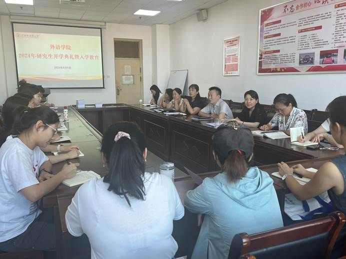 本网讯(文/闫舒瑶 图/蒋宜轩)2024年9月6日,外语学院在教学实验大楼A638会议室举行2024级研究生开学典礼暨入学教育。外语学院领导班子、研究生导师、有关科室负责人、辅导员以及全体研究生参加了本次活动,研究生办主任蒋宜轩主持开学典礼。