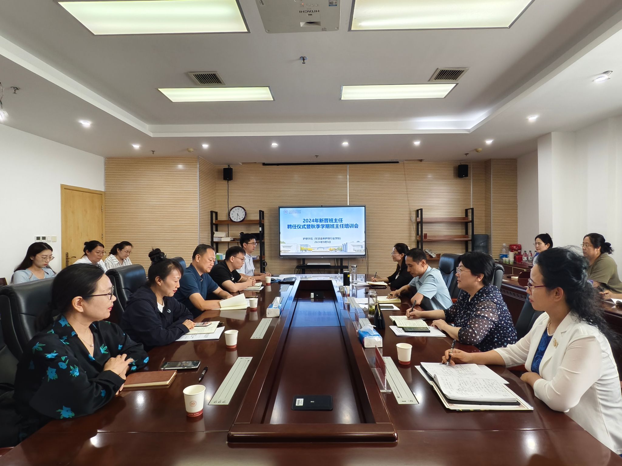 本网讯(文/图 王琪琪 )为加强班主任队伍建设,进一步提升班主任的育人能力,2024年9月5日,护理学院(智慧康养护理行业学院)在BS704会议室召开2024年新晋班主任聘任仪式暨秋季学期班主任培训会。学院领导班子、班主任代表和全体辅导员参加会议,会议由学院党委副书记杨雪主持。