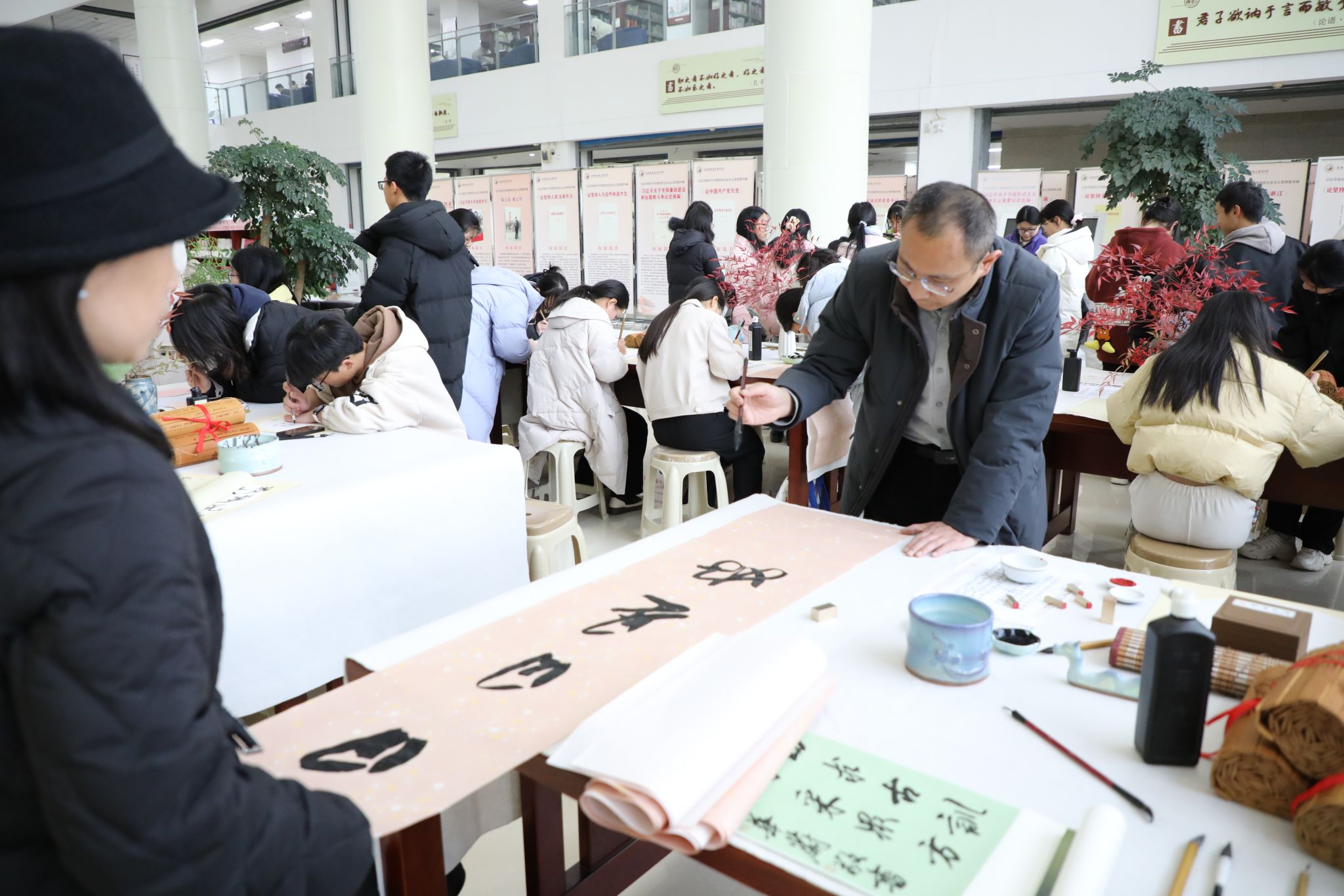 本网讯(文图/马亚玲)2024年12月10日下午,由图书馆指导书友会与大学生书画协会联合举办的“书书联动---当颜如玉遇见兰亭序”阅书籍、写书法主题活动在图书馆二楼大厅成功举办。活动由图书馆副馆长吴晓萍主持,图书馆领导班子、部分职工和全校师生书画爱好者参加。活动还特邀河南省书法家协会会员耿华蔚老师现场指导。