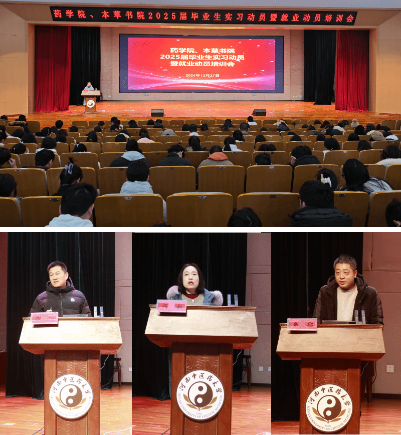 本网讯(文/姚柯杉 图/上官宇轩 宋雨蒙)为顺利推进2025届毕业生实习工作,给毕业生提供更好的实习指导服务,有序开展毕业各项工作,药学院、本草书院于2024年12月27日举行2025届毕业生实习动员暨就业动员培训会。药学院副院长朱鑫、本草书院兼药学院副院长高巍、药学院科研办公室主任张飞、本草书院双创孵化中心主任武永勇,药学院教师、本草书院毕业班辅导员和2025届全体毕业生参加本次培训会。会议由武永勇主持。