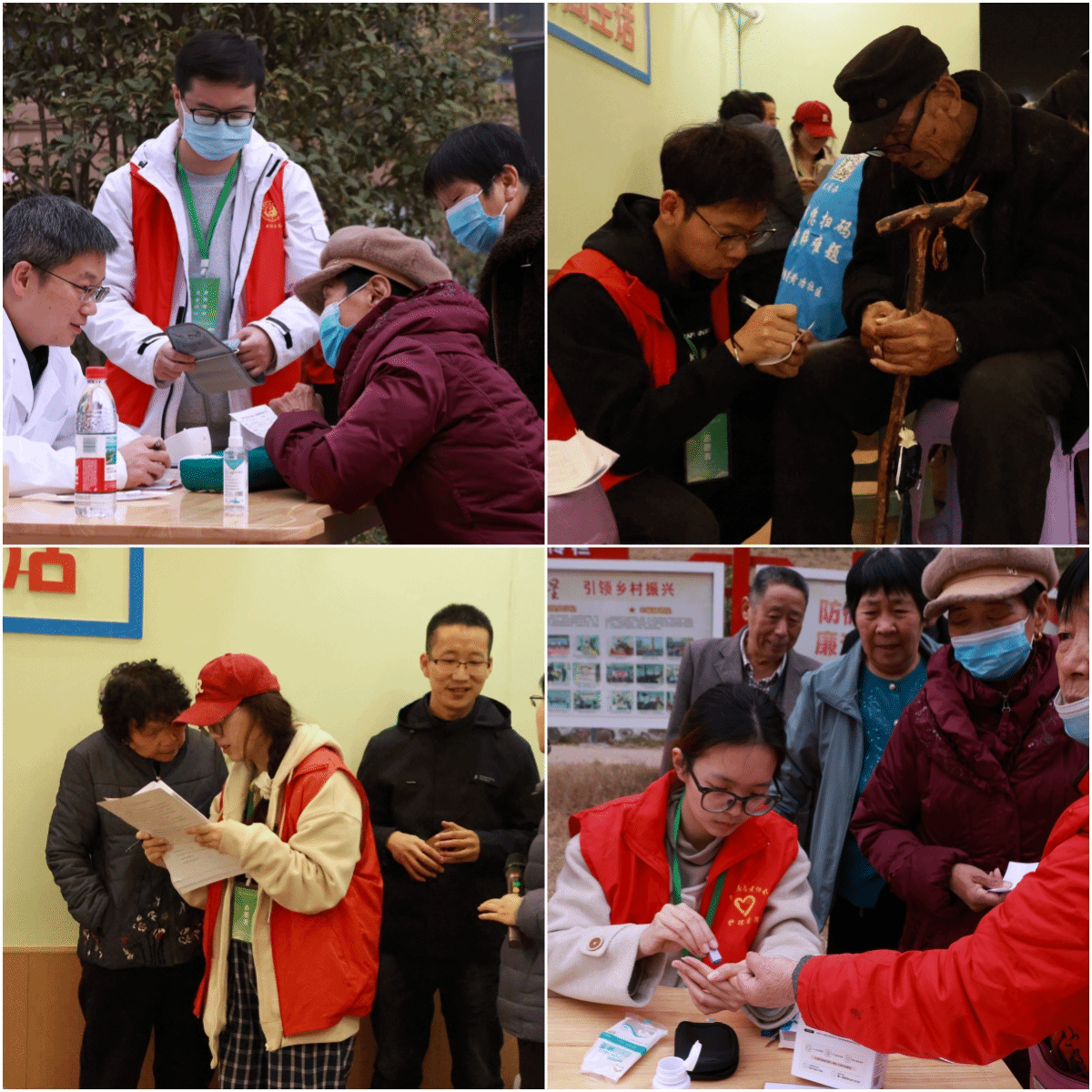 此次志愿者服务,在发挥管理学院心理学、健康管理、中医文化等学科特长的同时,又得到我校一附院心内二科李明主任、一附院龙子湖院区张俊红主任、任蕾元总务护士、翟亚美护士和护理学院学生志愿者的大力支持。志愿服务涵盖医疗义诊、健康科普、心理疏导、中医药文化宣传、法律咨询和关爱留守老人等。在黄冶社区日间照料中心门前,分设了呼吸病、心血管病、儿科病、慢性病义诊区和耳穴贴敷、血压血糖检测、刮痧等中医特色医疗服务区,还有健康管理咨询、心理疏导、法律咨询等服务点。