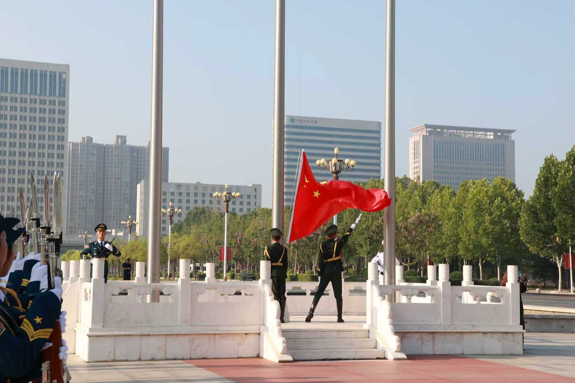 仪式现场,我校大学生仪仗队身姿挺拔、步伐铿锵,护送五星红旗正步走向升旗台。五星红旗在雄壮的国歌声中冉冉升起,在晨曦中迎风飘扬。现场师生庄严肃立,齐唱国歌,向国旗行注目礼,点燃了在场每一位师生的爱国热情。