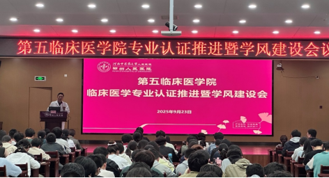本网讯(文/崔昭玥 图/吕明阳)为持续提升教育教学质量,构建优良学风,第五临床医学院于2025年9月23日在文化路校区门诊八楼礼堂召开临床医学专业认证推进暨学风建设会,学院班子成员、学工办、教研室秘书和教师代表、辅导员、班主任代表、在校本科生300余人参会。