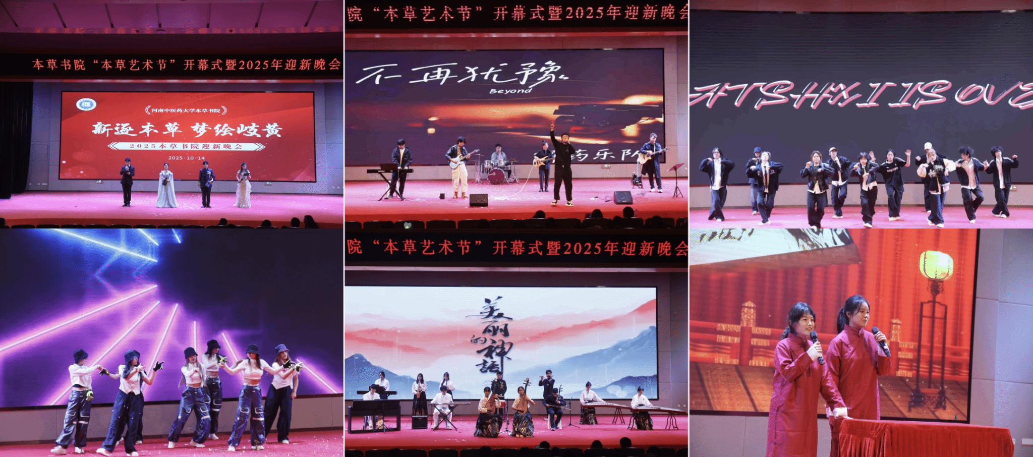 作为书院“本草艺术节”的开篇活动,本次晚会以“新逐本草,梦绘岐黄”为主题,分为“逐梦本草·启新程”“砥砺深耕·创辉煌”“初心如磐·向未来”三个篇章。第一篇章为“逐梦本草·启新程”,聚焦新生初入书院的新鲜与热忱:街舞《意料之中》的表演者们踩着鼓点舞动,利落的转身、有力的跳跃,把刚进校园的少年意气展现得淋漓尽致。朗诵《红铁》则用激昂的文字,把“担当”二字刻进人心,每一句诵读都像是在诉说“作为中医药学子,要扛得起责任”。民舞《灼灼芳华》水袖扬起时似白芍舒展,舞步轻移间如牡丹绽放,让新生直观感受东方美学的魅力。而街舞《Swing Noir》的表演者们,都是书院“青春夜校”爵士舞班的学员,他们利用课后碎片时间反复打磨动作,把课余热爱化作舞台上的亮眼表现,也让新生看到了书院丰富的课余生活。第二篇章为“砥砺深耕·创辉煌”,用多元节目讲述成长与传承的故事:街舞《幻想童话》里,舞者们用灵动的动作编织出青春的美好愿景,仿佛在诉说“只要敢想,就能实现”的成长信念。礼仪舞《雅步礼行》则把“礼”字搬上舞台,抬手、屈膝、迈步间满是端庄,让新生在欣赏中读懂中华礼仪的韵味;合唱《红豆》的两位新生歌手,用温柔的嗓音演绎“红豆生南国”的诗意,简单的旋律却勾起了不少人对家乡、对亲情的牵挂。乐器表演《海德薇变奏曲》一响起,熟悉的旋律瞬间引发共鸣,也传递出“面对挑战不退缩、团队协作共成长”的青春态度。相声《非同一般的电影》更是把现场气氛推向轻松时刻,表演者用幽默的对话解构青春里的趣事。民舞《空台戏》,以传统戏曲的身段为底,用舞蹈讲述故事,让新生在一招一式里感受传统文化的深厚底蕴。第三篇章为“初心如磐·向未来”,用真挚表演传递对未来的期许:解药乐队一登场,《想去海边》的轻快、《蓝莲花》的坚定、《不再犹豫》的热血便接连上演,吉他声、鼓声与歌声交织,点燃了全场对未来的向往。街舞《leftright》的表演者们用左右交替的律动,展现出“青春不怕试错”的坦荡。乐器伴舞《一步之遥》则画风一转,琴弦轻颤间,舞者的裙摆随旋律流转,将艺术的浪漫与温柔悄悄融进夜色。最后,乐器表演《美丽的神话》用悠扬的旋律为晚会收尾,熟悉的曲调里满是温暖,也为新生的书院生活埋下了美好的伏笔。