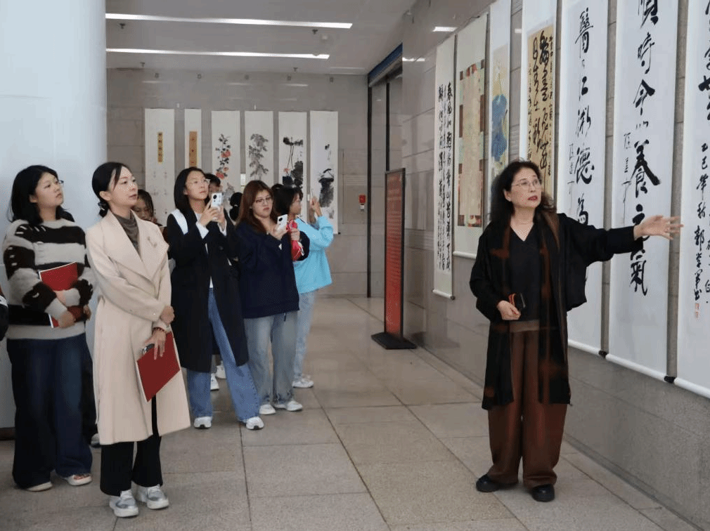 活动现场,同学们有序地步入展厅,我校书画院副院长、秘书长、学校关工委成员、尚真书院关工委副主任张峥丽老师担任导赏,带领同学们品读百余件书法、绘画及篆刻作品。她从传统笔墨的气韵生动,讲到现代创作的审美表达,细致解读每件作品的艺术风格与文化意蕴。同学们或凝神聆听,或举起手机记录动人细节,在静谧而专注的氛围中感受艺术与心灵的交融。活动尾声,师生合影留念,将这堂生动美育课的珍贵瞬间永久珍藏。