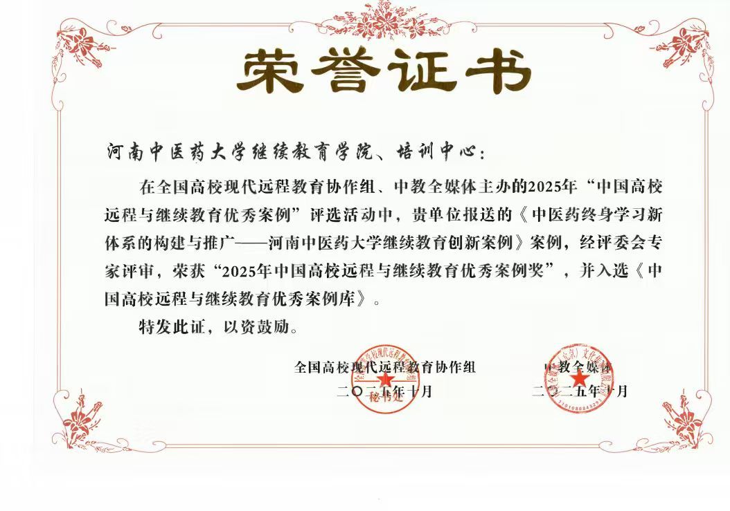 大会期间,全国各高校及其校外教学点的继续教育工作成果得到集中展示,一批表现突出的单位获得表彰。根据行业推选和评委会推荐,我校继续教育学院、培训中心申报的“中医药终身学习新体系的构建与推广——河南中医药大学继续教育创新案例”获评“2025年中国高校远程与继续教育优秀案例”,并入选《中国高校远程与继续教育优秀案例库》。我校推荐的郑州仲景国医中等专业学校和焦作职工医学院被评为“2025年度高校继续教育优秀校外教学点”。