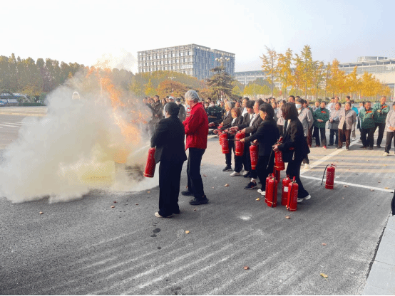 随后,全体参训人员在学校南大门开放区域开展灭火器实操演练。在教员的专业指导下,全体参训人员一同有序参与灭火器等设备的实际操作。通过亲身体验和动手练习,大家进一步掌握了消防设备的使用技能,有效提升了应急处置能力。