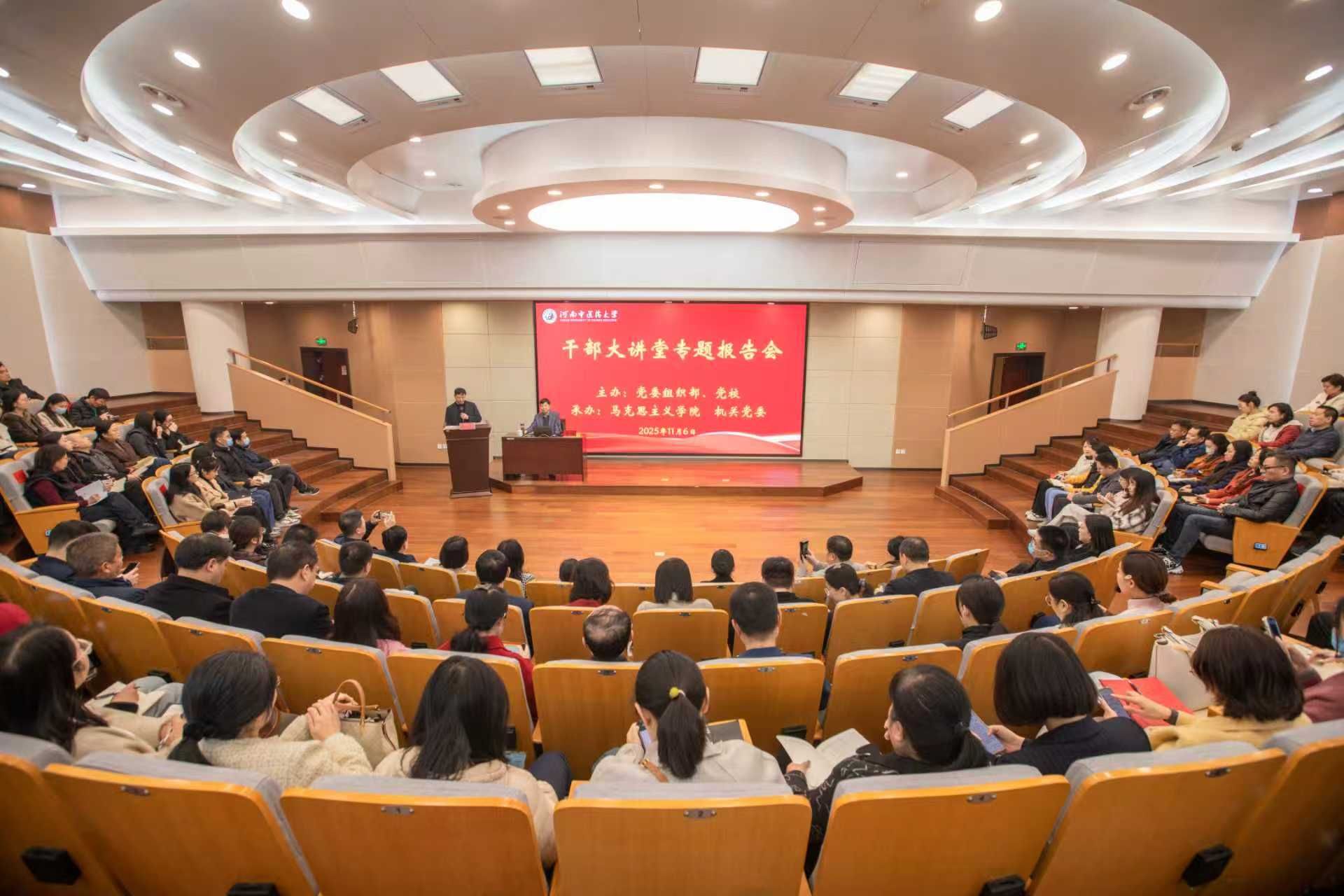 本网讯(文/机关党委、马克思主义学院 图/吴晋一)为深入学习贯彻习近平新时代中国特色社会主义思想,推动党的创新理论入脑入心,2025年11月6日上午,由党委组织部主办,机关党委与马克思主义学院承办的干部大讲堂专题报告会在俊学楼A114会议室举行。报告会邀请河南大学马克思主义学院博士生导师欧健教授作辅导报告。机关党员干部和马克思主义学院师生共170余人参加学习,报告会由马克思主义学院党委书记蔡信强主持。