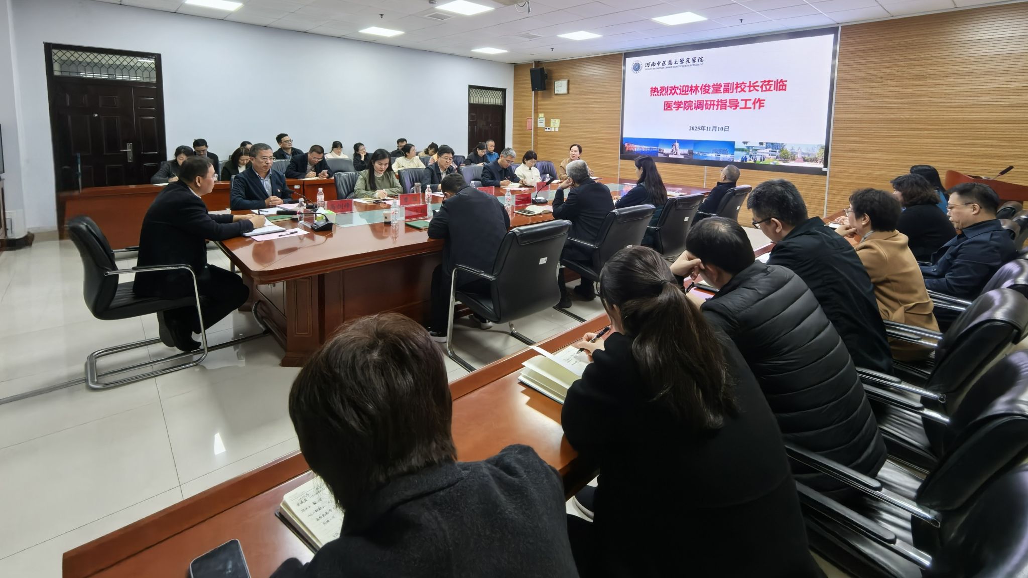 本网讯(文/图 殷萌琪)为了学习贯彻落实党的二十届四中全会精神,更好地推动医学院高质量发展,2025年11月10日下午,副校长林俊堂深入医学院开展调研指导。调研座谈会在教学实验大楼A447会议室举行,医学院全体班子成员、各科室党支部书记、主任、副主任及青年骨干教师代表参加会议。