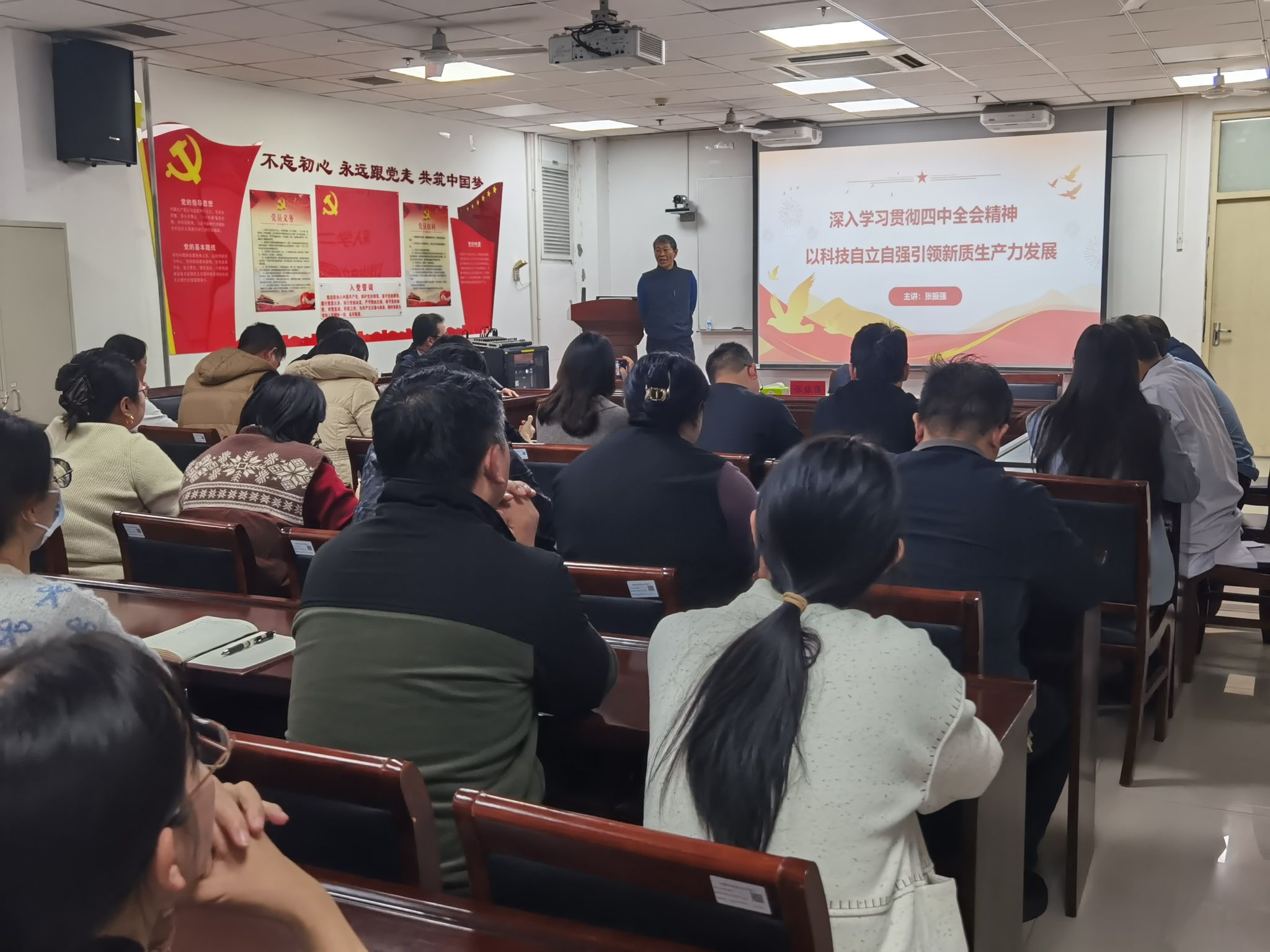 本网讯(文/王胜超 图/张钟允 张飞宇)2025年11月12日,中医药科学院组织召开党的二十届四中全会精神专题学习研讨会。副校长张振强到会指导,并作题为《深入学习贯彻四中全会精神 以科技自立自强引领新质生产力发展》的专题报告。会议由中医药科学院党委书记李东阳主持,全体教职工党员参加学习。
