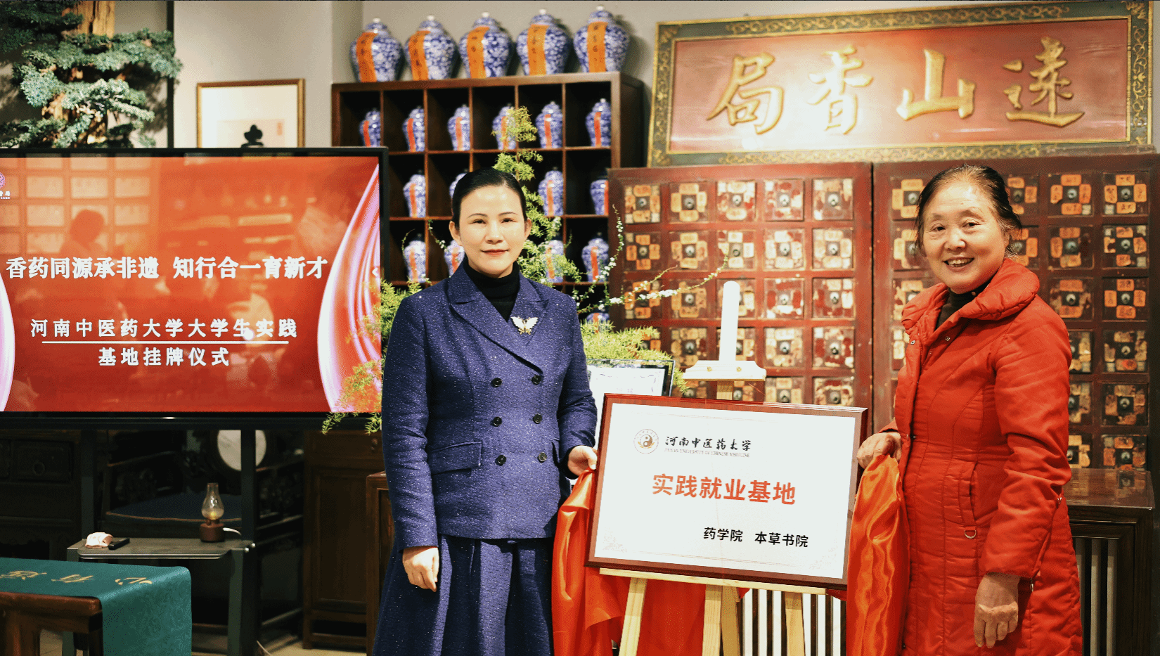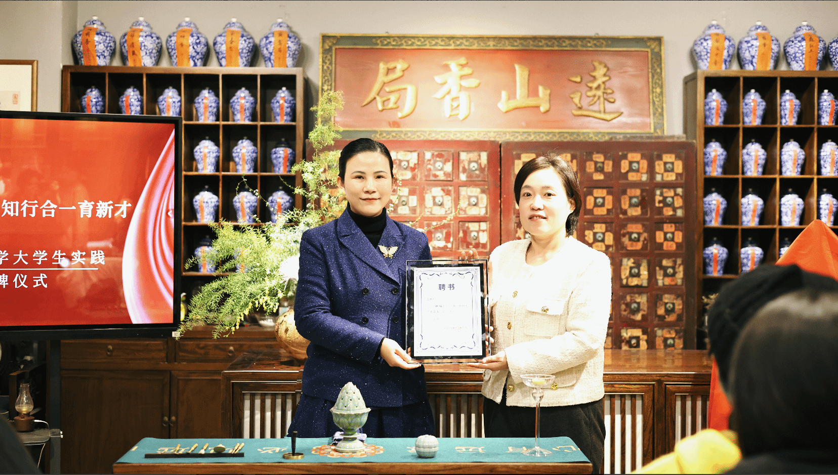 为搭建长效实践育人平台,本草书院与远山香局举行了实践基地签约仪式,并为曹佳颁发本草书院通识教育导师聘书。高巍表示,书院将以实践基地为依托,常态化开展劳动实践活动,助力学生在传承中华优秀传统文化中锤炼专业技能,激发专业认同感与学习热情。