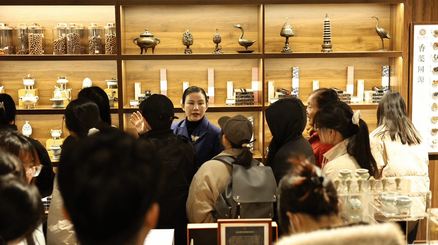 活动伊始,师生一行率先走进远山香局非物质文化遗产展厅。展厅内陈列的各类纯手作香品琳琅满目,以中药材为核心配方的香牌、手串等香气醇厚,兼具养生功效与艺术价值,蕴含传统美学理念。同学们驻足观赏,在视觉与嗅觉的双重体验中,感知中医药与传统香文化的紧密关联。